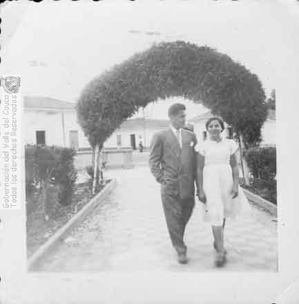 JESUS GARCIA (1955). La pareja de esposos Arcadio Prieto y Blanca, en el parque principal de Guacarí & 602507. GUACARI: Biblioteca Departamental Jorge Garces Borrero.
