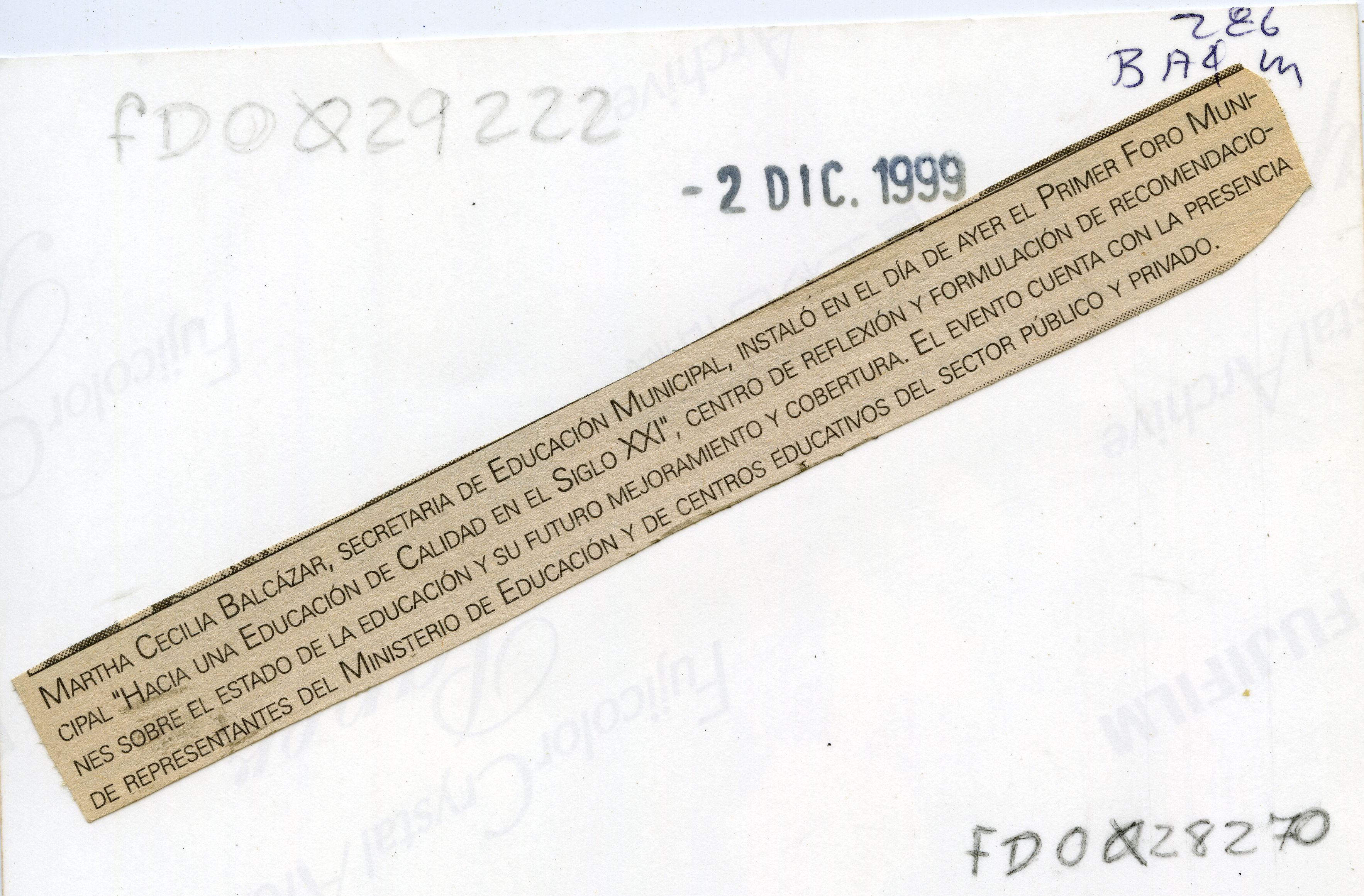 Martha Cecilia Balcázar, secretaria de educación municipal, instaló en el día de ayer el primer foro municipal "hacia una educación de calidad en el siglo XXI", centro de reflexión y formulación de recomendaciones sobre el estado de educación y su futuro mejoramiento y cobertura. El evento cuenta con la presencia de representantes del ministerio de educación y centros educativos del sector público y privado.