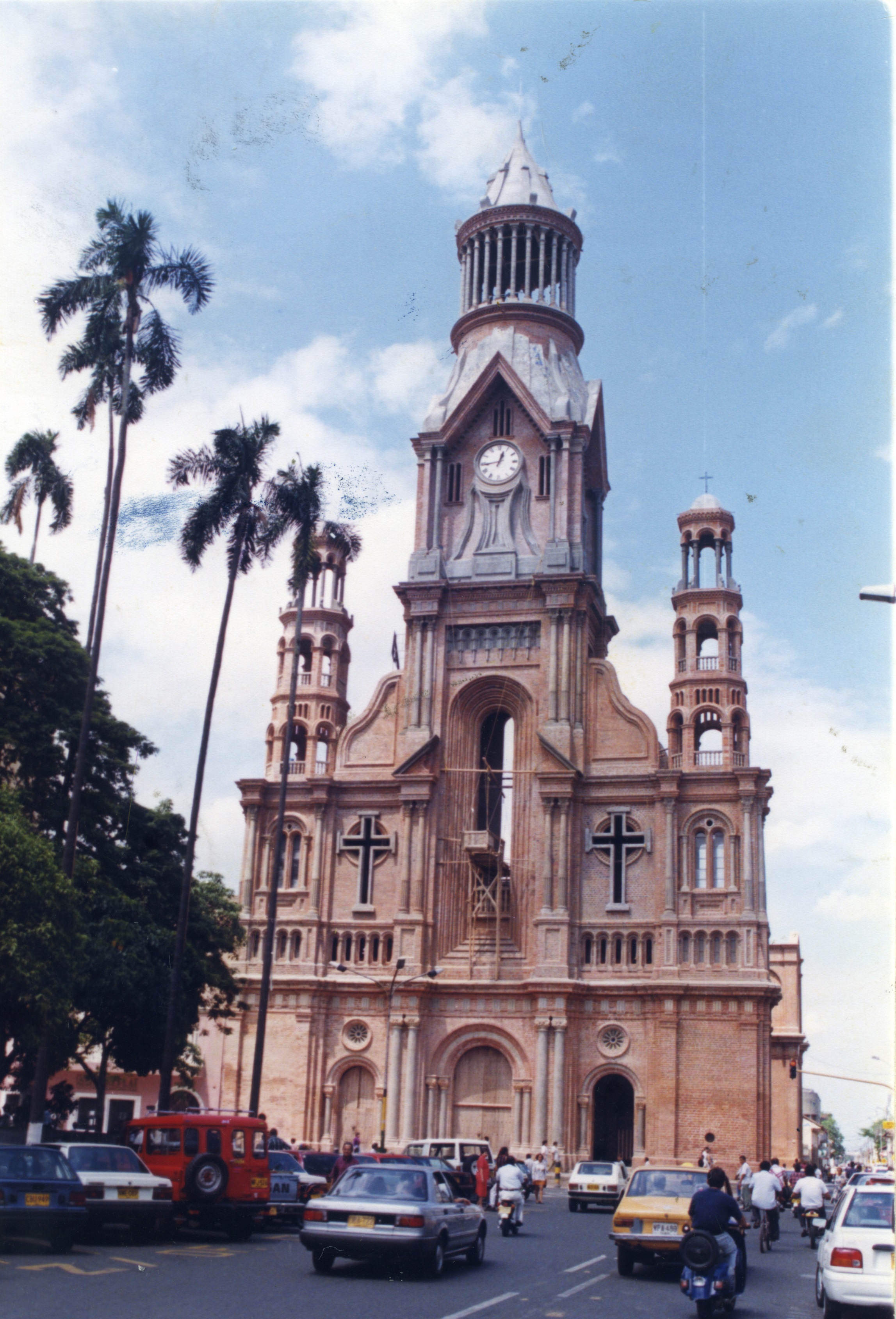Aspecto de la fachada de la catedral de Nuestra Señora del Palmar. Se aprecia al lado izquierdo el parque, las calles y medios de transporte