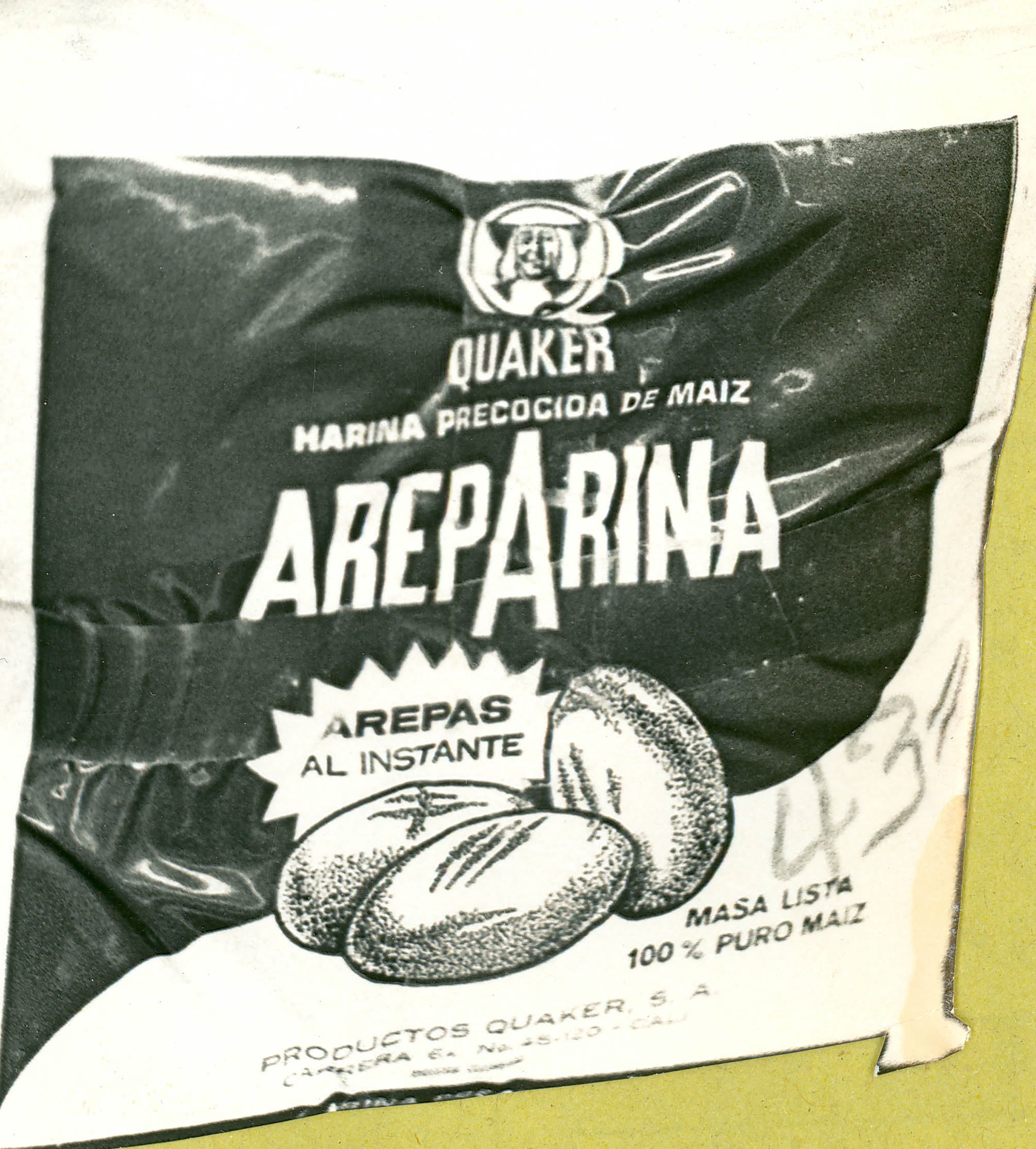 Areparina (harina precocida de maiz) Quaker. // El Archivo del Patrimonio Fotográfico y Fílmico del Valle del Cauca es responsabilidad de la Biblioteca Departamental del Valle Jorge Garcés Borrero, por convenio de cooperación suscrito con la Secretaría de Cultura Departamental, con el fin de aunar esfuerzos para la conservación, preservación y divulgación del Archivo entre la comunidad Vallecaucana, especialmente entre los estudiantes e investigadores que visitan la Biblioteca, propiciando su uso y consulta permanente. La universidad Icesi es un colaborador en el proceso de difusión, facilitando la tecnología que permite la consulta de las imágenes.