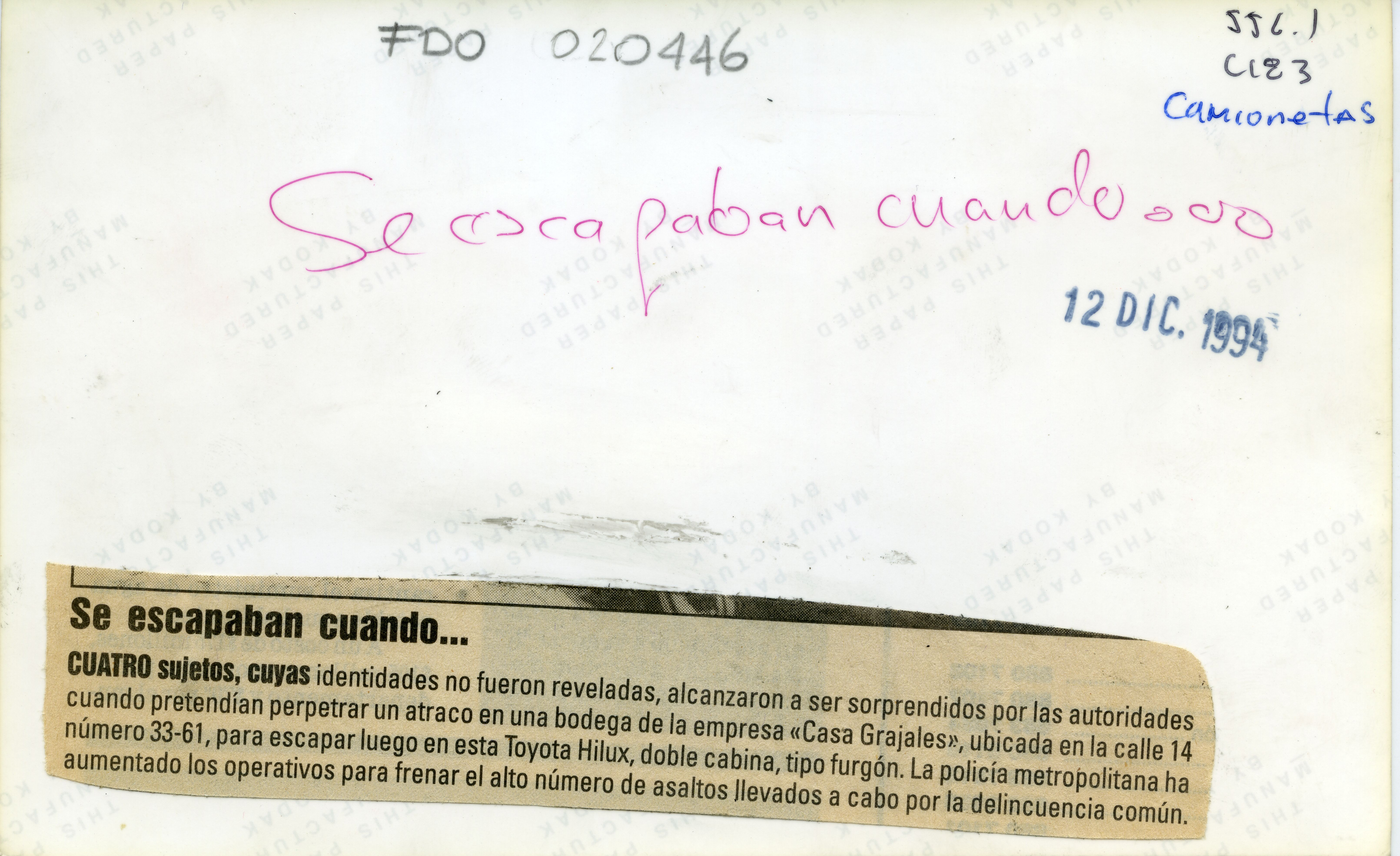 Camioneta Toyota Hilux con modulo de carga. Se observan varios carros parqueados. Al reverso de la fotografía se anexa recorte: "Se escapaban cuando... CUATRO sujetos, cuyas identidades no fueron reveladas, alcanzaron a ser sorprendidos por las autoridades cuando pretendían perpetrar un atraco en una bodega de la empresa «Casa Grajalesu, ubicada en la calle 14 número 33-61, para escapar luego en esta Toyota Hilux, doble cabina, tipo furgón. La policía metropolitana ha aumentado los operativos para frenar el alto número de asaltos llevados a cabo por la delincuencia común."