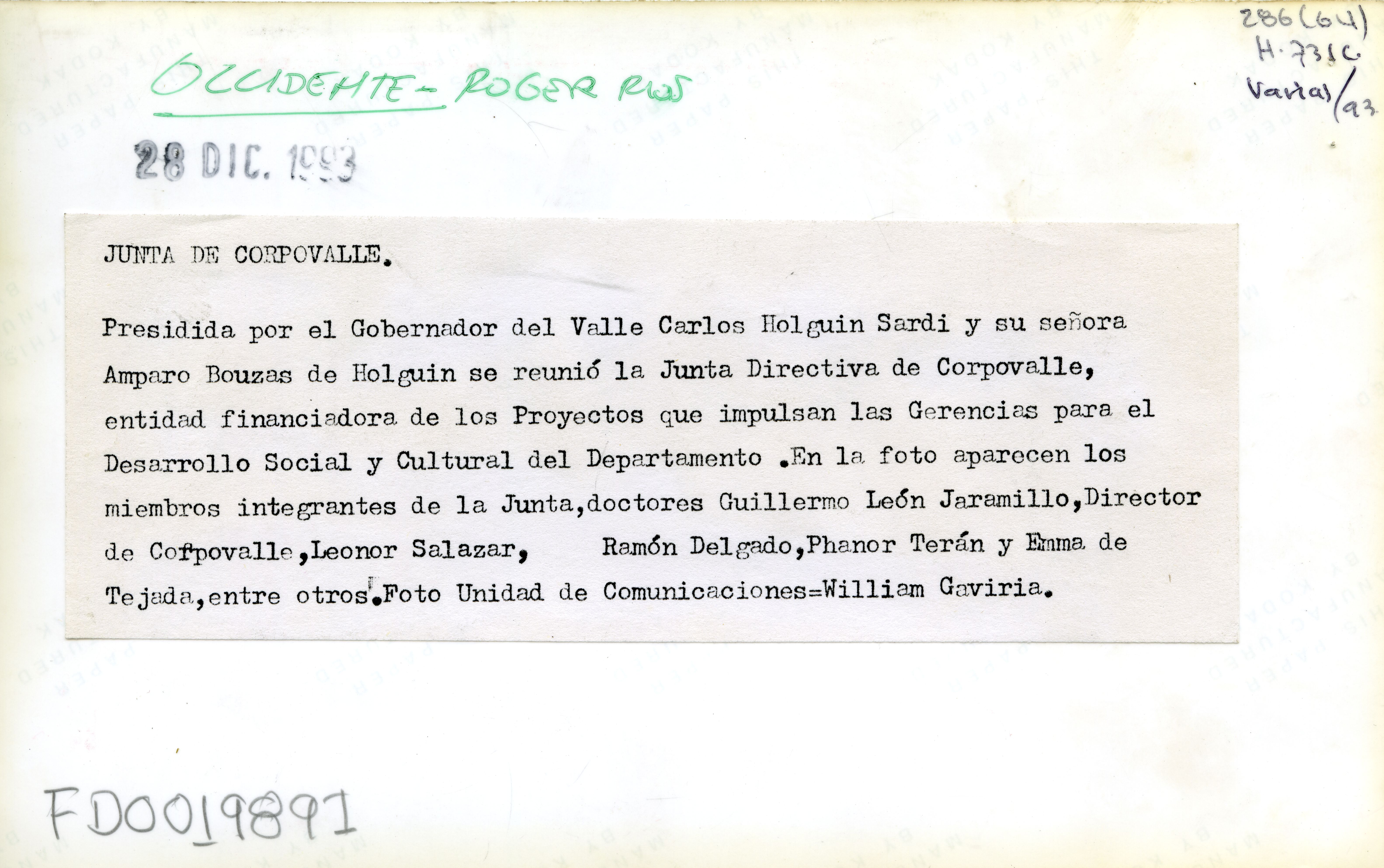 Reverso: Presidida por el gobernador del Valle del Cauca Carlos Holguín Sardi y su señora Amparo Bouzas de Holguín se reunió la Junta Directiva de Corpovalle, entidad financiera de los proyectos que impulsan las gerencias para el Desarrollo Social y Cultural del Departamental. En la foto aparecen los miembros integrantes de la junta, doctores Guillermo león Jaramillo, director de Corpovalle, Leonor Salazar, Ramón Delgado, Phanor Terán y Emma de Tejada, entre otros. Foto Unidad de Comunicaciones William Gaviria