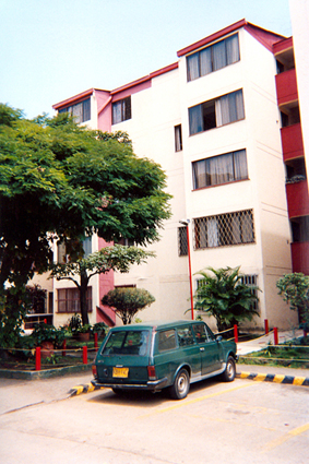 Exterior día. En esta toma vertical se aprecian tres elementos fundamentales. El árbol a la izquierda, el automóvil marca Fiat 147 y la unidad residencial de cinco niveles y pintada de color carmín y crema.