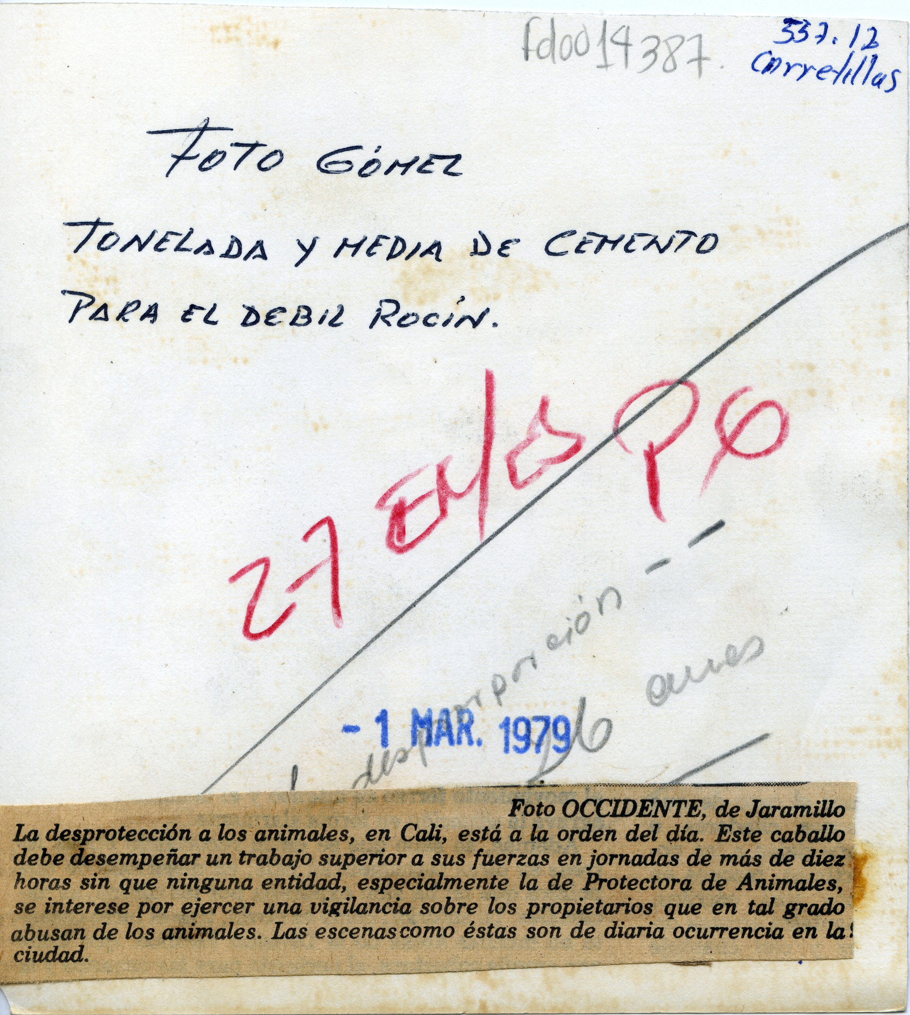 | dc.description.abstract | Se observa una carretilla con cemento haciendo un giro en la vía. Al reverso de la fotografía se anexa recorte: "La desprotección a los animales, en Cali, está a la orden del día. Este caballo debe desempeñar un trabajo superior a sus fuerzas en jornadas de más de diez horas sin que ninguna entidad, especialmente la de Protectora de Animales, se interese por ejercer una vigilancia sobre los propietarios que en tal grado abusan de los animales. Las escenas como éstas son de diaria ocurrencia en la ciudad." | spa |