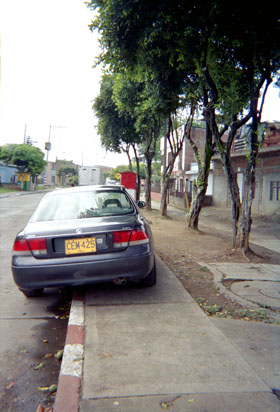 Toma lateral de casas. Exterior día. Carro como punto distintivo. Alineación recta de árboles en costado derecho. Plano medio.