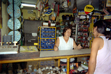Interior de una ferretería. Se observa una mujer atendiendo a una joven ubicada en el lado derecho de la imagen en contraplano. Plano medio. Imagen tomada con flash.