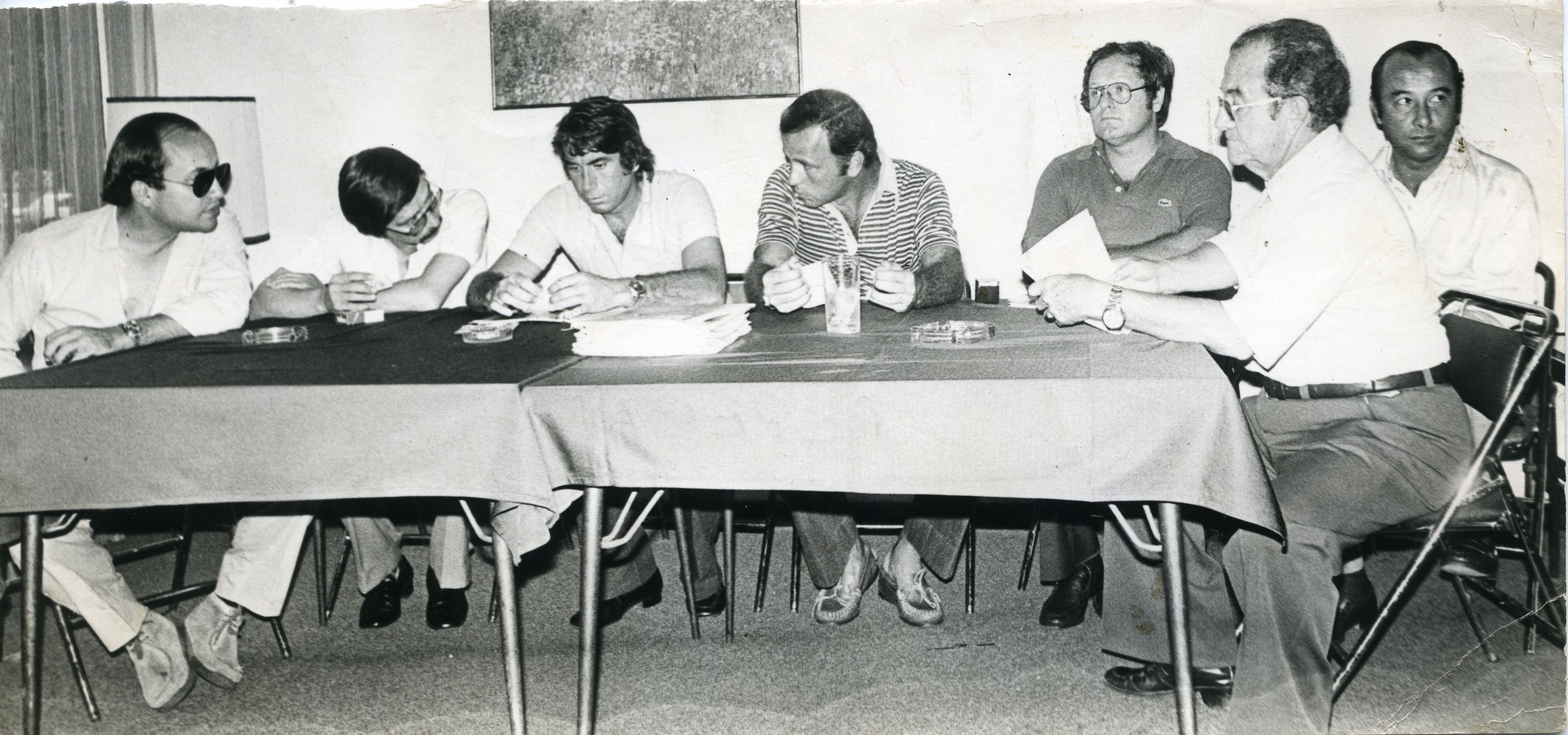 Fotografía de gran plano general en donde es posible observar a siete personas reunidos alrededor de una mesa.