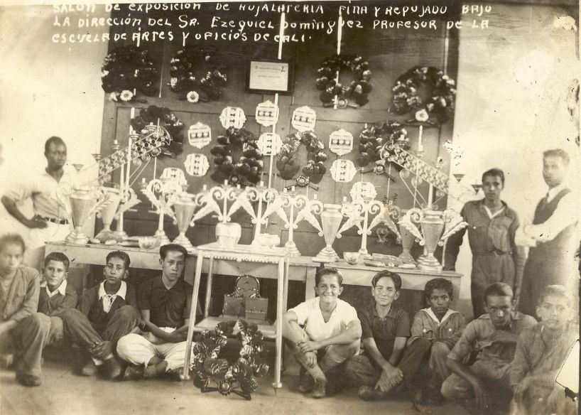 Escuela de Artes y oficios, exposición de relojería y repujado bajo la dirección del profesor Ezequiel Domínguez. Esta institución se creo por Acuerdo Municipal No 25 de 1933, que ordeno construir una escuela de formación técnico-práctica, para dar respuesta a la necesidad de mano de obra capacitada, requerida por el crecimiento industrial y urbano de la ciudad. A partir de 1945 se le empezo a llamar Instituto Antonio José Camacho. Actualmente lo conocemos como Instituto Educativo Técnico Industrial Antonio José Camacho. Santiago de Cali, 1940.