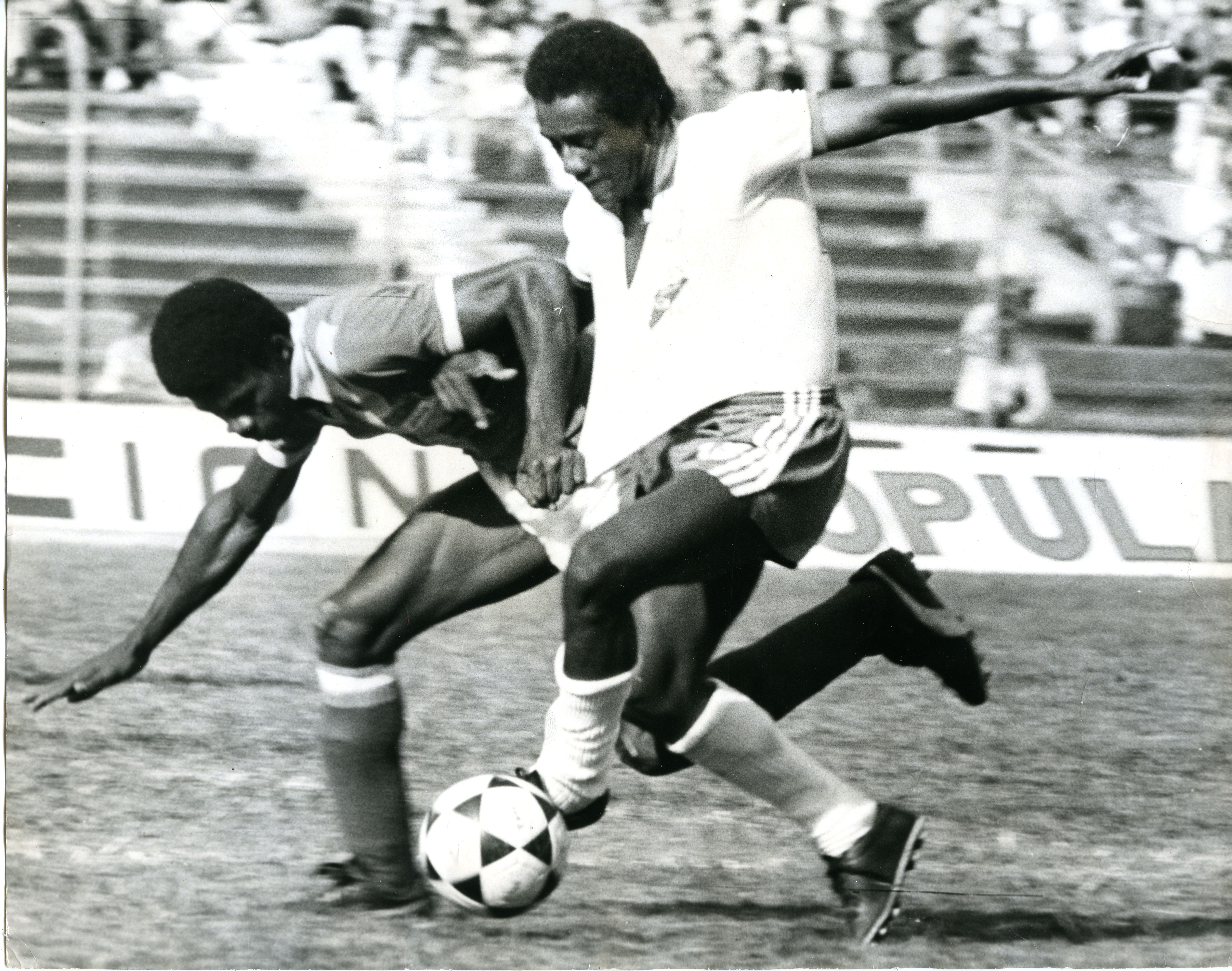 Foto cuerpo completo Gilmar Aponzá jugando con un balón que se encuentra en la esquina inferior izquierda