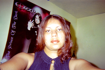 Primer Plano. Imagen tomada en el interior de una vivienda, con luz de flash, donde se destaca una mujer joven de cabello rojizo, con su mirada hacia la cámara. Al fondo un cartel de un grupo de rock. Los colores de los muros son crema.