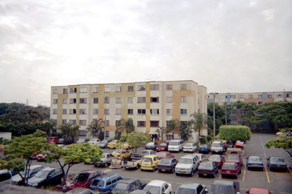 Plano general. Toma de edificio en enfoque central con autos en base de cuadro. Exterior día. Sobredimensión objetual. Contraste por volumen.