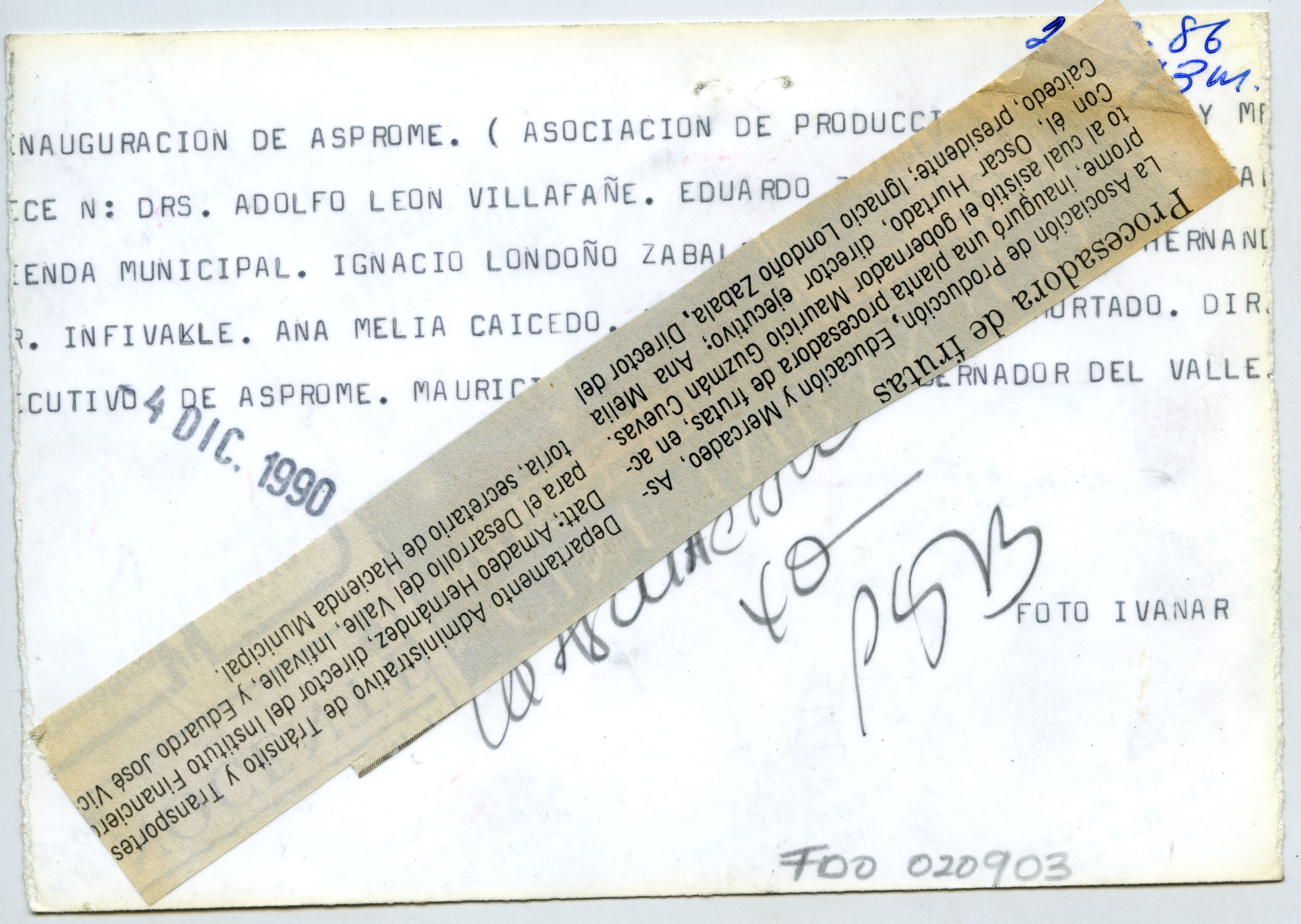 | dc.description.abstract | La Asociación de Producción, Educación y Mercadeo, Asprome, inauguró una planta procesadora de frutas, en acto al cual asistió el gobernador Mauricio Guzmán Cuevas. Con él, Oscar Hurtado, director ejecutivo; Ana Melia Caicedo, presidente; Ignacio Londoño Zabala, Director del Departamento Administrativo de Tránsito y Transportes Datt; Amadeos Hernández, director del Instituto Financiero para el Desarrollo del Valle, Infivalle y Eduardo José Victoria, secretario de Hacienda Municipal | spa |