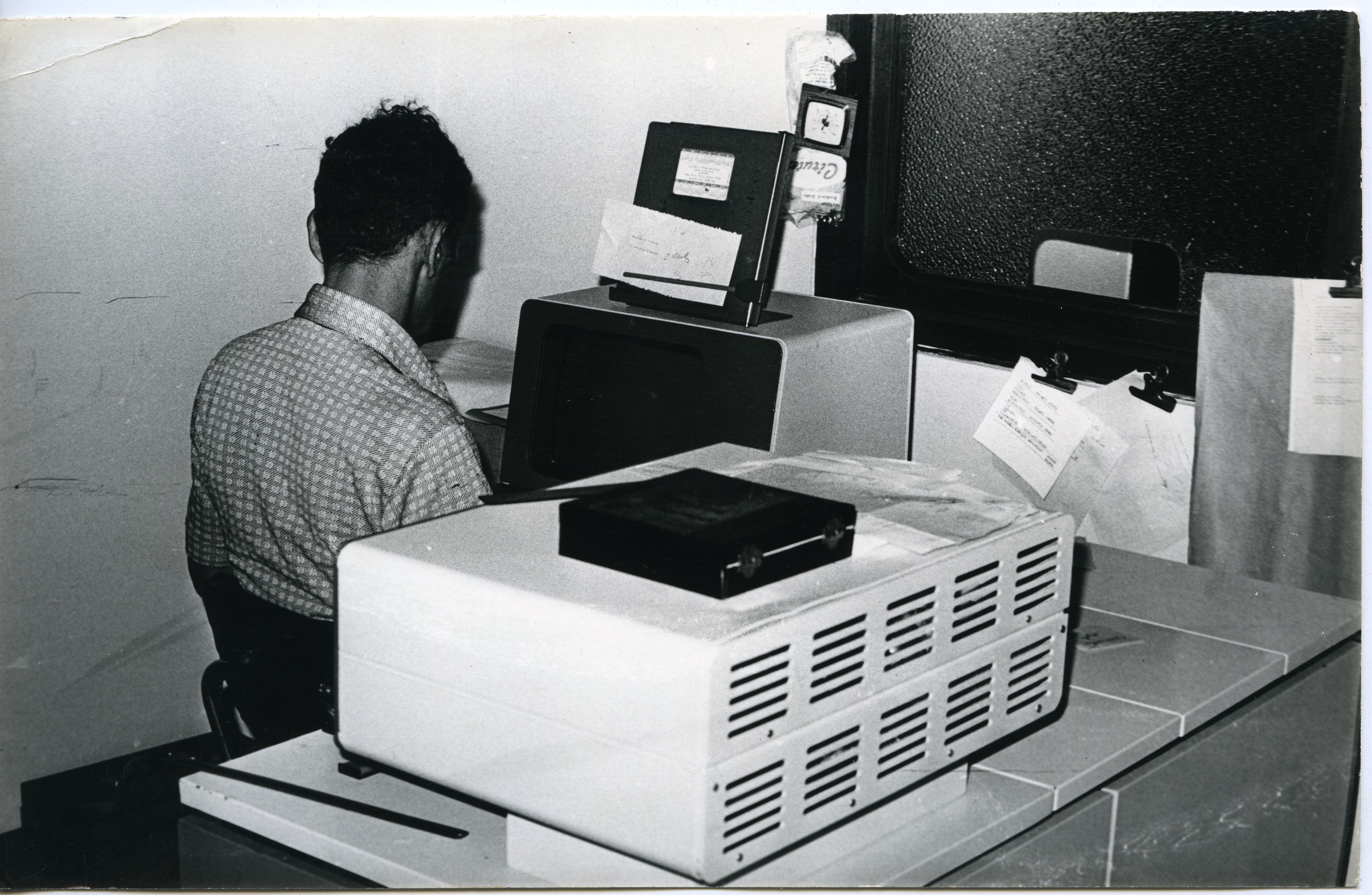 Fotografía de un operario de la maquina I.B.M en las instalaciones de Diario de Occidente.