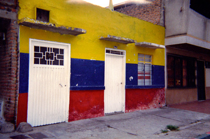 Plano Medio. En esta imagen se destaca una fachada de una vivienda pintada con los colores patrios, contrastando con las puertas metálicas de color blanco. A lado y lado otras edificaciones con acabados en cemento y ladrillo.