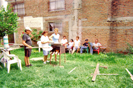 Plano Medio. Imagen tomada en exterior, con luz de sol. Un grupo de personas reunidas en un parque están preparando un sancocho en un fogón de hierro. Al fondo la fachada de una vivienda con ladrillo a la vista y varias personas sentadas a la sombra.