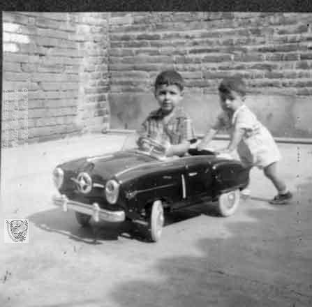 Los hermanos Jorge Alberto G. y Luis Carlos, jugando a los carros, el más pequeño empuja al más grande. Tuluá, C.1965