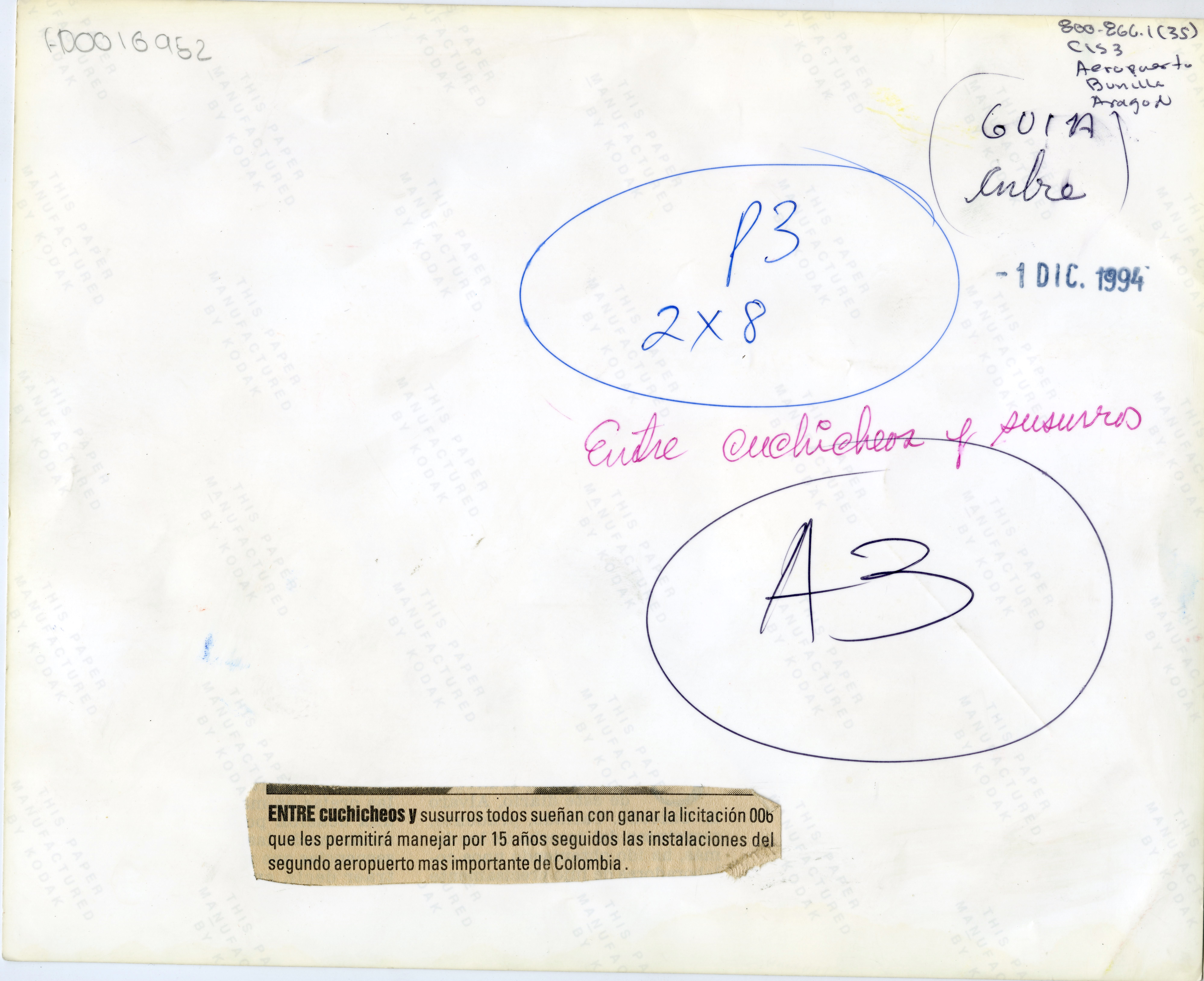 Al reverso de la fotografía se anexa recorte: "Entre cuchicheos y susurros todos sueñan con ganar la licitación 006 que les permitirá manejar por 15 años seguidos las instalaciones del segundo aeropuerto más importante de Colombia."