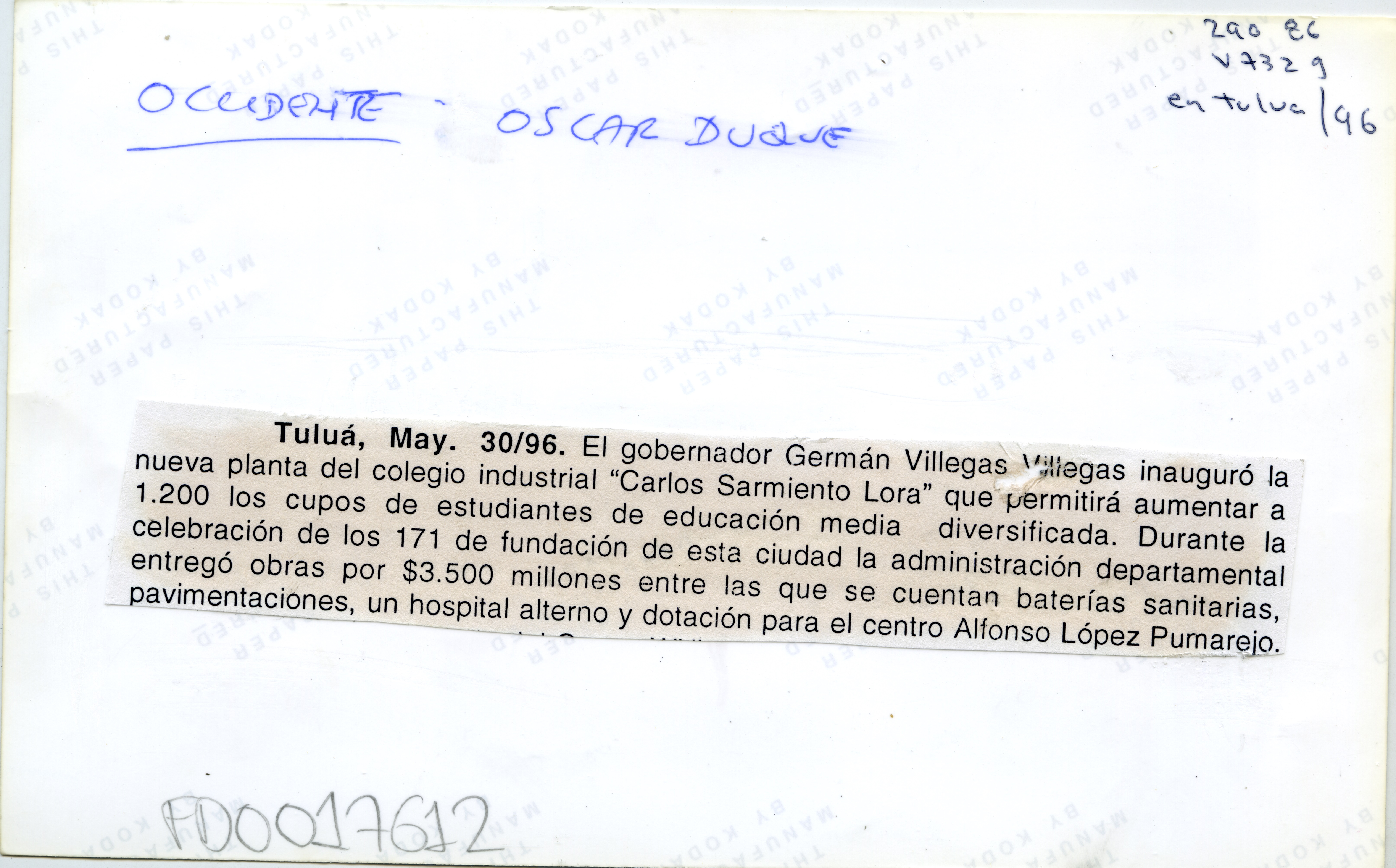 Al reverso de la fotografía se anexa recorte: " El gobernador Germán Villegas Villegas inauguró la nueva planta del colegio industrial "Carlos Sarmiento Lora" que permitirá aumentar a 1.200 los cupos de estudiantes de educación media diversificada. Durante la celebración de los 171 de fundación de esta ciudad la administración departamental entregó obras por $3.500 millones entre las que se cuentan baterías sanitarias, pavimentaciones, un hospital alterno y dotación para el centro Alfonso López Pumarejo."