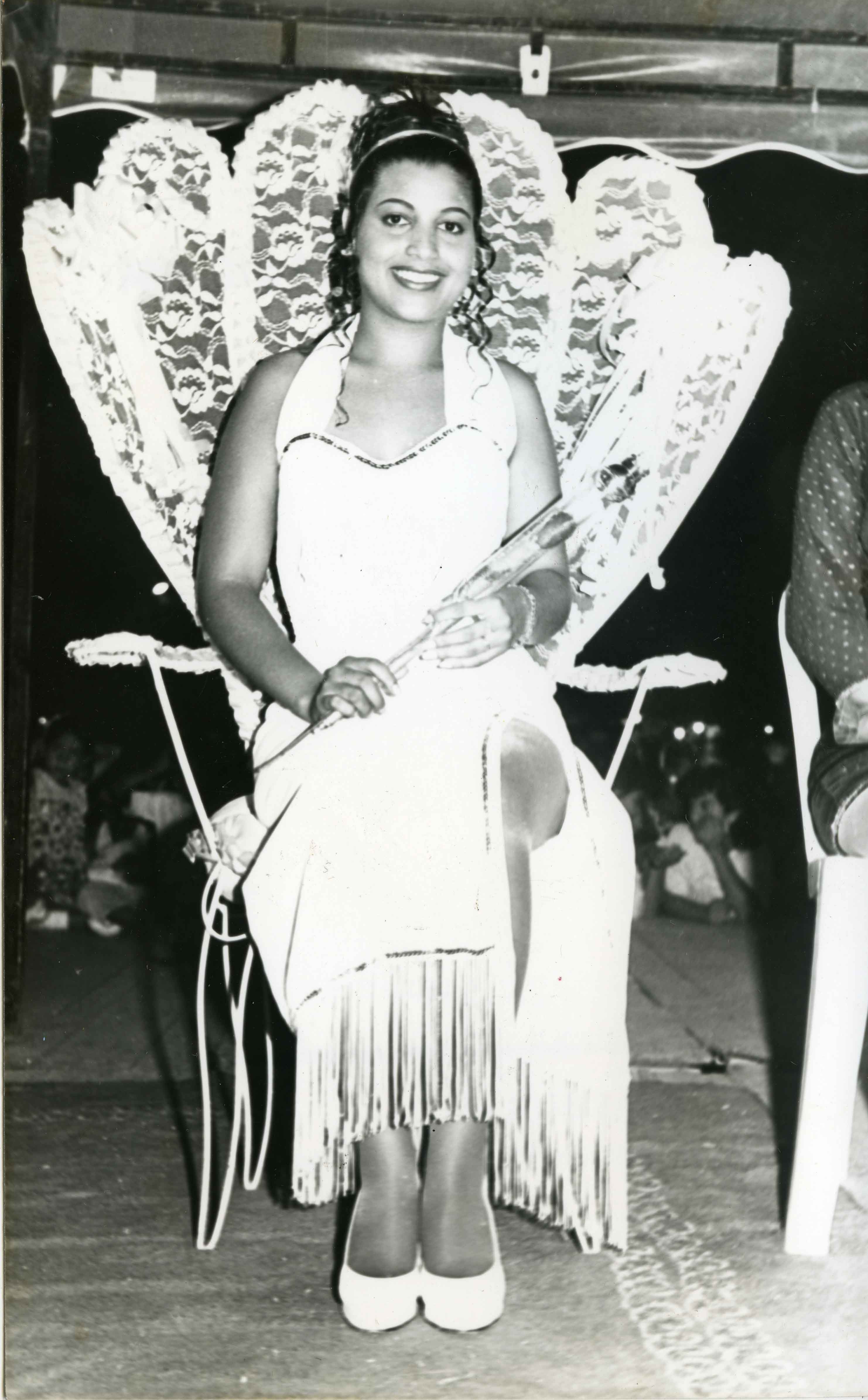 En el pie de foto dice lo siguiente: Sonia Lucía Cortés, la reina que le entregó el cetro y la corona a Mary Luz Betancourt, también se expresó ante los moradores de Aguablanca agradeciéndoles todo el apoyo que recibió por parte de ellos.- El Archivo del Patrimonio Fotográfico y Fílmico del Valle del Cauca es responsabilidad de la Biblioteca Departamental del Valle Jorge Garcés Borrero, por convenio de cooperación suscrito con la Secretaria del Cultura Departamental, con el fin de aunar esfuerzos para su conservación, preservación y divulgación del Archivo entre la comunidad Vallecaucana, especialmente entre los estudiantes e investigadores que visitan la Biblioteca, propiciando el su uso y consulta permanente. La universidad Icesi es un colaborador en el proceso de difusión, facilitando la tecnología que permite la consulta de las imágenes.