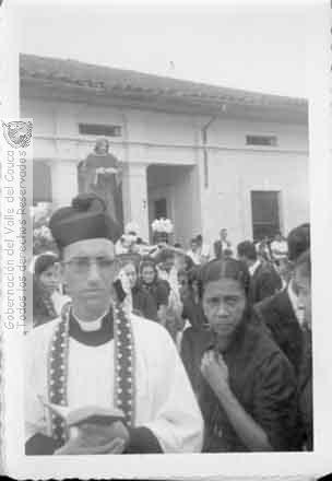 Procesión de Semana Santa pasando por el edificio de la antigua estación del ferrocarril. Pbro. Jaramillo, atrás la señora Elisa Casierra. Obando. 1962
