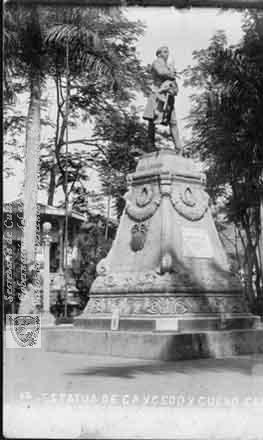 Pedestal con la estatua de Caicedo y Cuero, ubicada en el Parque Bolívar. Cali. C. 1940.