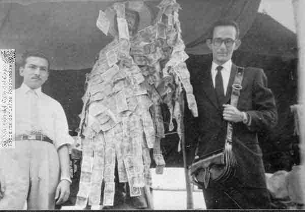 Celebración de la fiesta de San Isidro. este Santo es el patrono de los campesinos pues se tiene la creencia que es el quien regula el clima y da buenas cosechas. Entre las ofrendas al santo se le simbolizan productos y dinero. En la foto el señor eduardo Hoyos. Trujillo, 1970.