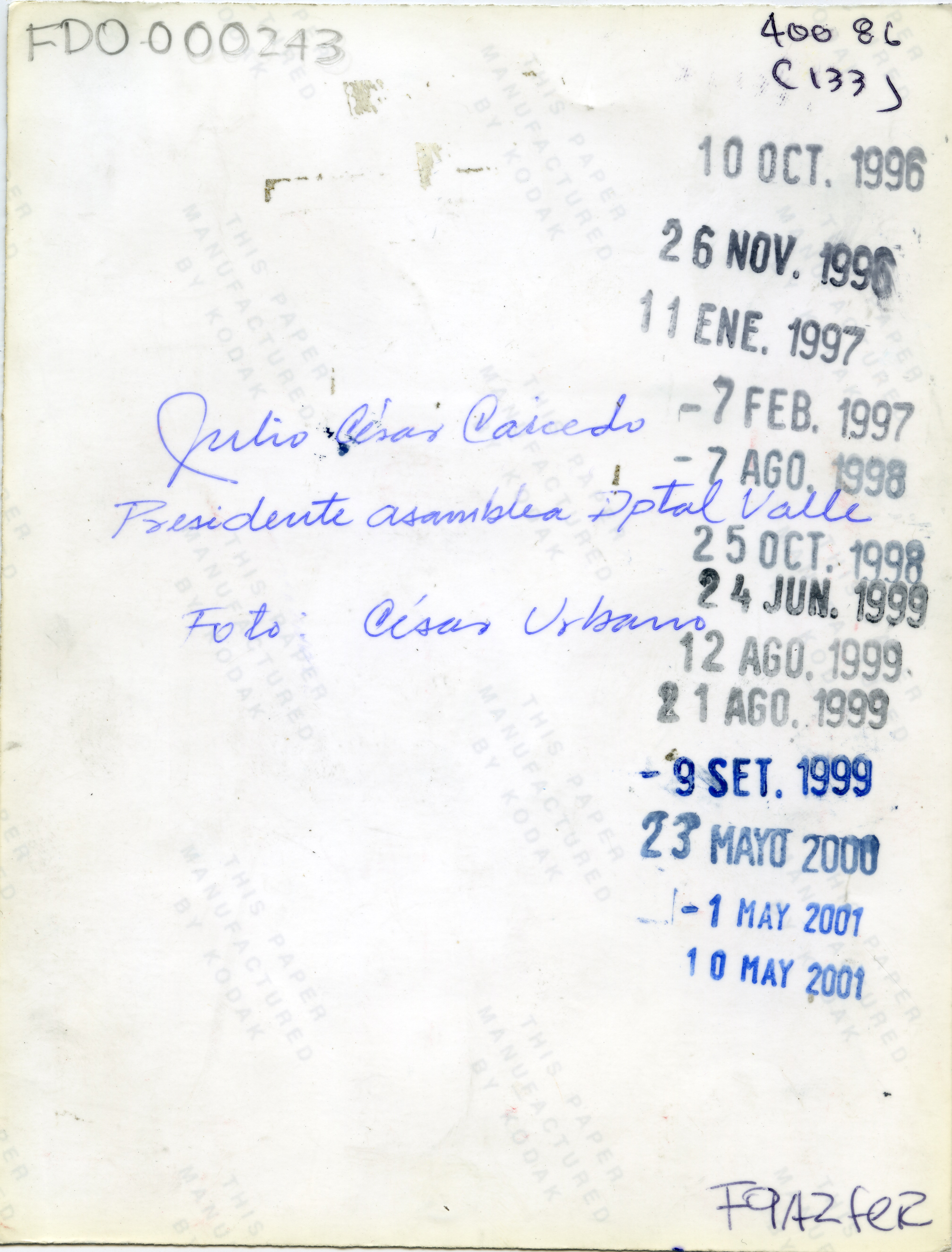 Julio César Caicedo Zamorano, Presidente de la Asamblea Departamental del Valle del Cauca, Senador de la República. El Archivo del Patrimonio Fotográfico y Fílmico del Valle del Cauca es responsabilidad de la Biblioteca Departamental del Valle Jorge Garcés Borrero, por convenio de cooperación suscrito con la Secretaria del Cultura Departamental, con el fin de aunar esfuerzos para su conservación, preservación y divulgación del Archivo entre la comunidad Vallecaucana, especialmente entre los estudiantes e investigadores que visitan la Biblioteca, propiciando el uso y consulta permanente. La universidad Icesi es un colaborador en el proceso de difusión, facilitando la tecnología que permite la consulta de las imágenes.
