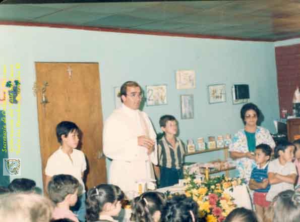 El Presbitero Hernando Palacios y la profesora Myriam Vargas durante una ceremonia en el Kinder El Divino Niño.Calima-Darién C. 1985