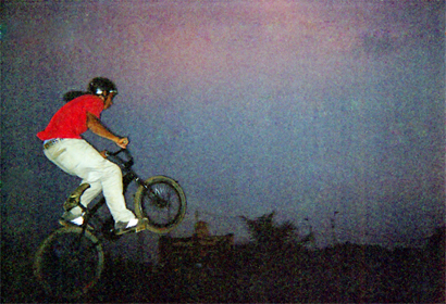 Un joven realiza un salto en una bicicleta tipo cross. Plano medio. Poca iluminación. Imagen tomada con flash.