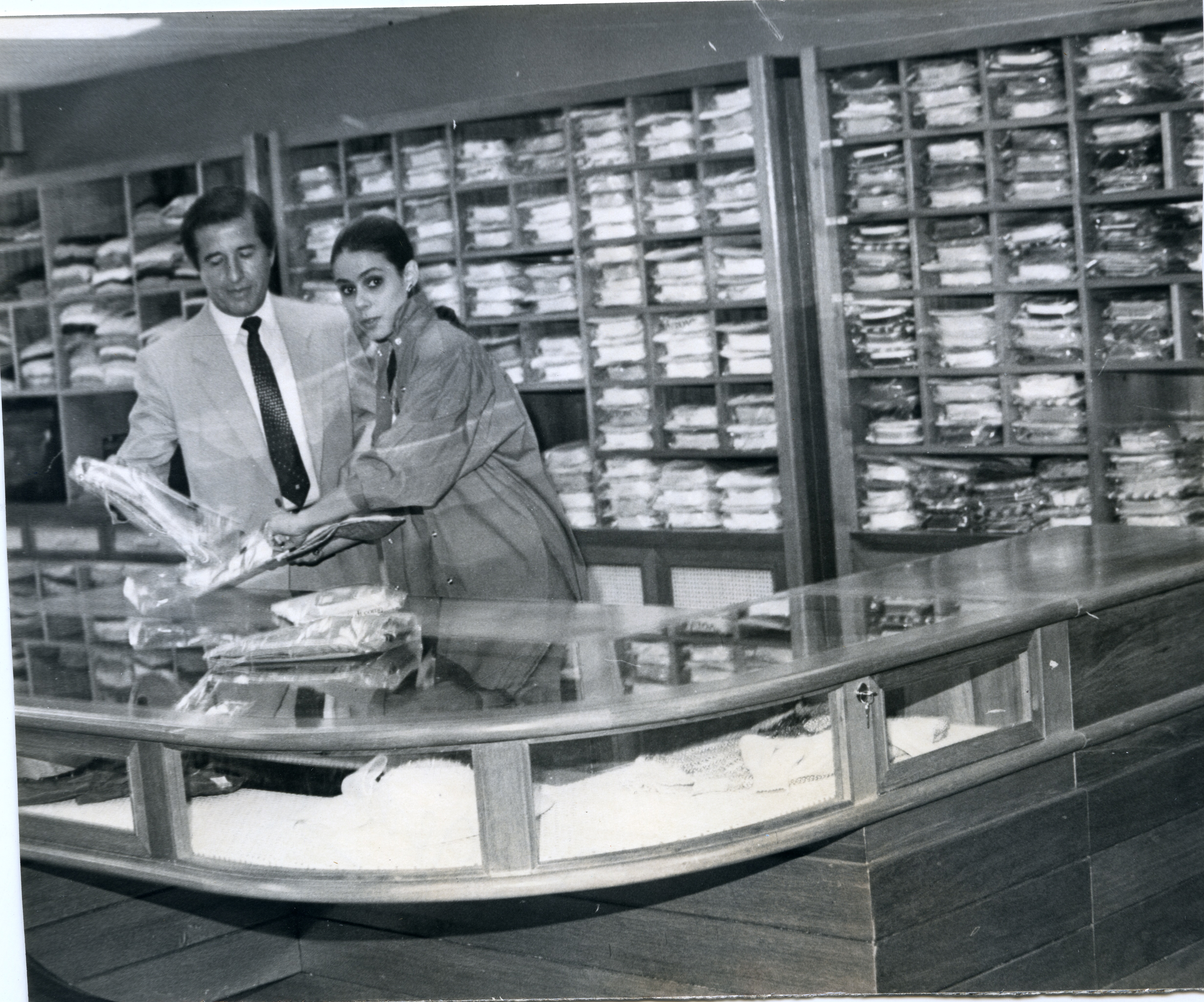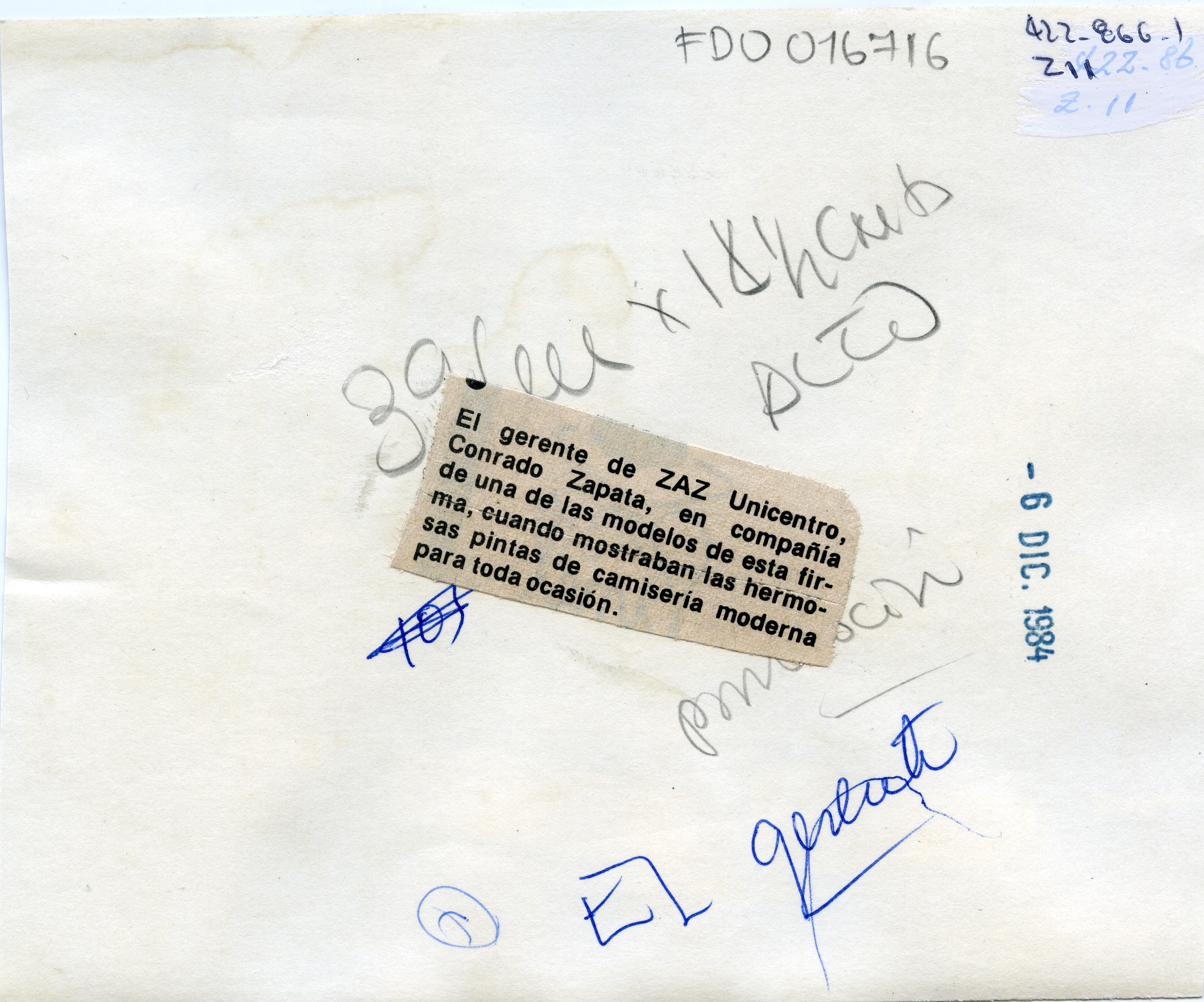 Al reverso de la fotografía se anexa recorte: "El gerente de Zaz Unicentro, Conrado Zapata, en compañía de una de las modelos de esta firma, cuanto mostraban las hermosas pintas de camisería moderna para toda ocasión."