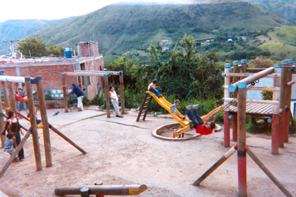 Parque infantil sector la Y. En este plano general los niños juegan en este precario parque. Se han implementado unos maderos escasamente pintados y se ven algunos toboganes. Al fondo la montaña y algunas casas.