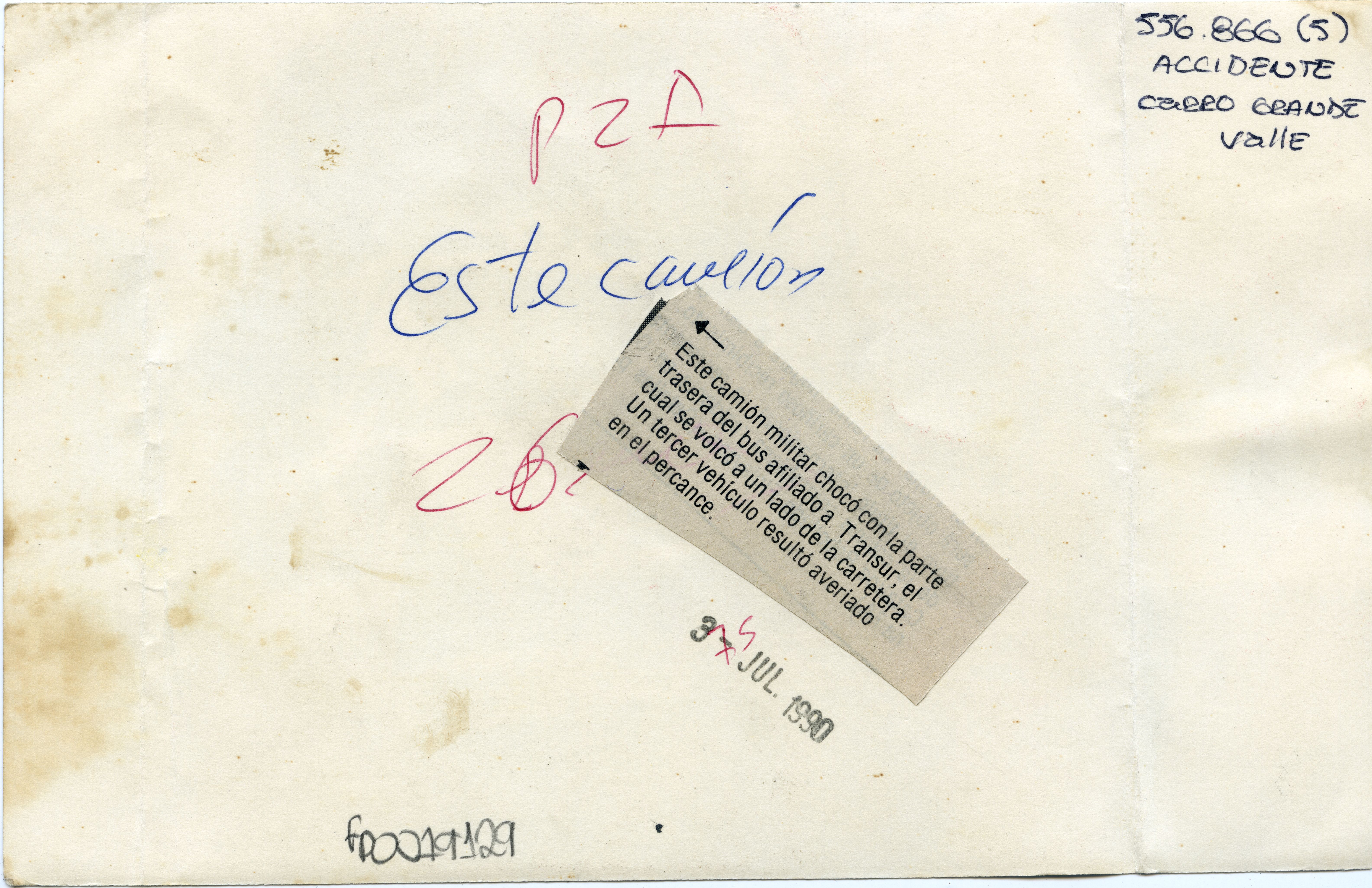 En la fotografía podemos observar un accidente de tránsito, en el que está involucrado un camión militar, un bus afiliado a la empresa Transur y otro vehículo. El incidente se dio porque el camión chocó la parte trasera del bus, lo cual provocó que este se volcara. Al reverso de la fotografía se anexa recorte: "Este camión militar chocó con la parte trasera del bus afiliado a Transur, el cual se volcó a un lado de la carretera. Un tercer vehículo resultó averiado en el percance."