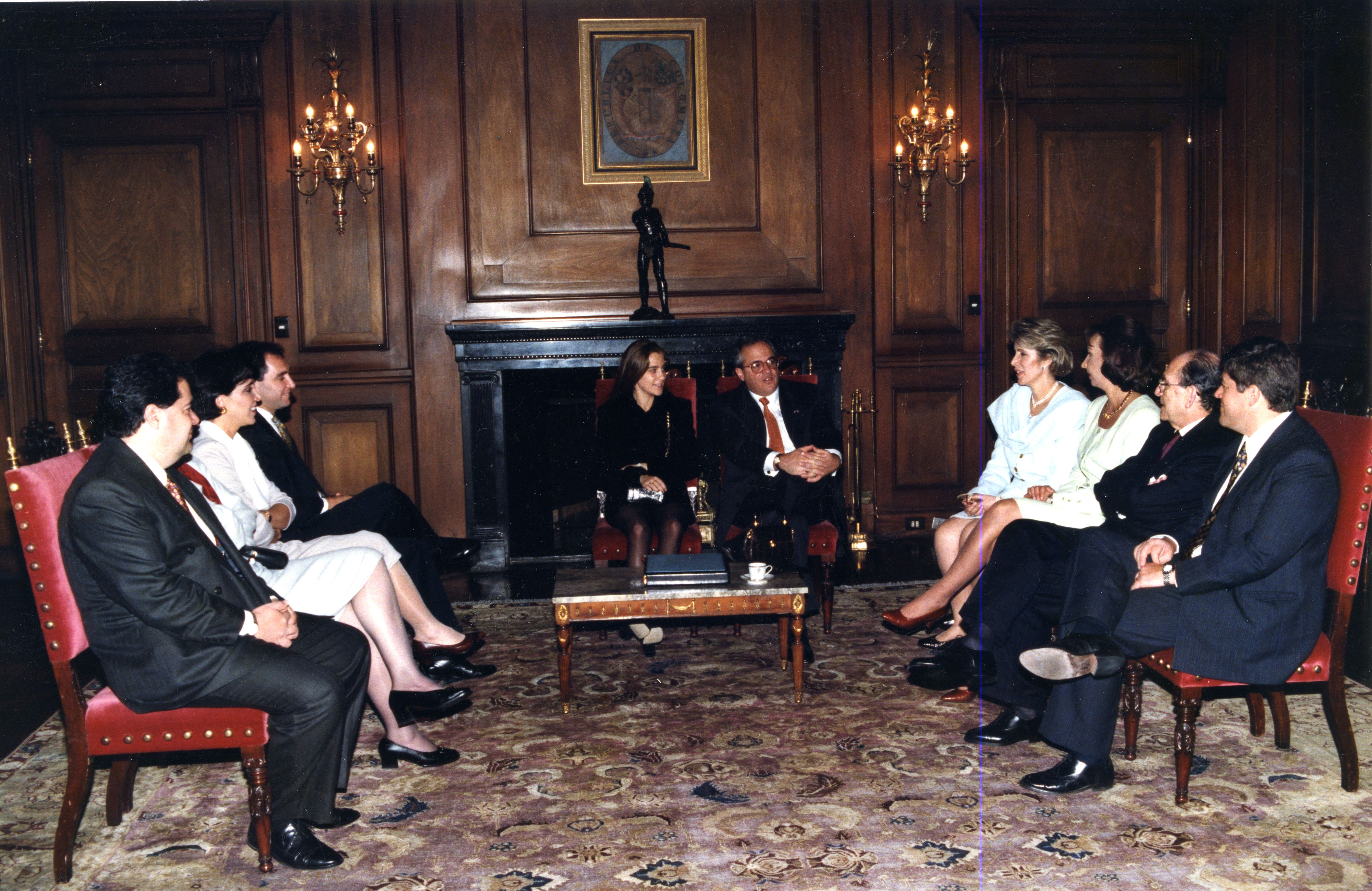 En la fotografía podemos observar una reunión con motivo de la toma de posesión del nuevo cargo de vicepresidente del señor Carlos Lemos Simmondns, en la gráfica aparece también el mandatario Ernesto Samper, junto a otros personajes.