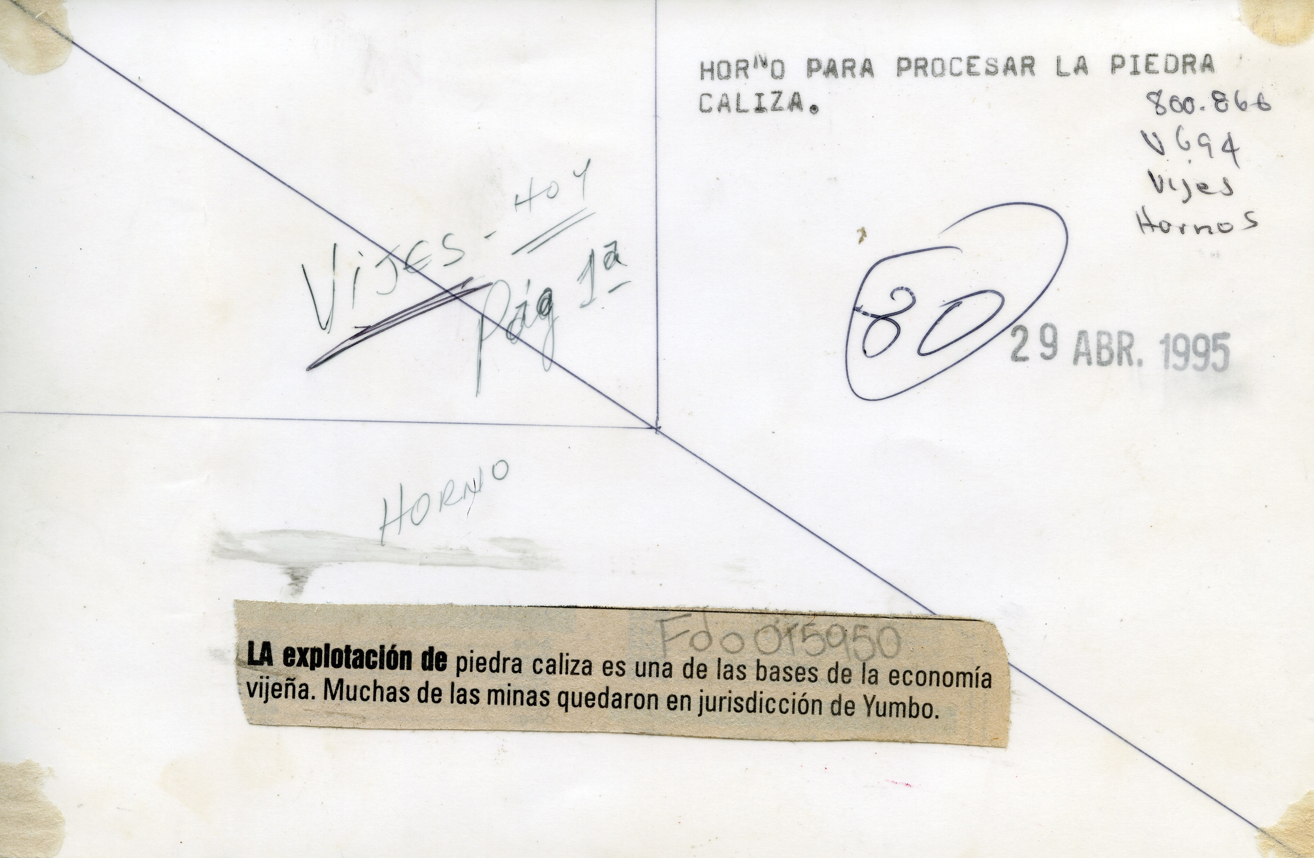 Al reverso de la fotografía se anexa el pie de foto del periódico: "LA explotación de piedra caliza es una de las bases de la economía vijeña. Muchas de las minas quedaron en juridisción de Yumbo"