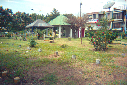 Parque del barrio La Nueva Base en el que se observa el salón comunal del barrio. Bolardos ubicados linealmente. Viviendas en cuadrante superior derecho. Al fondo vegetación exuberante. Plano general.