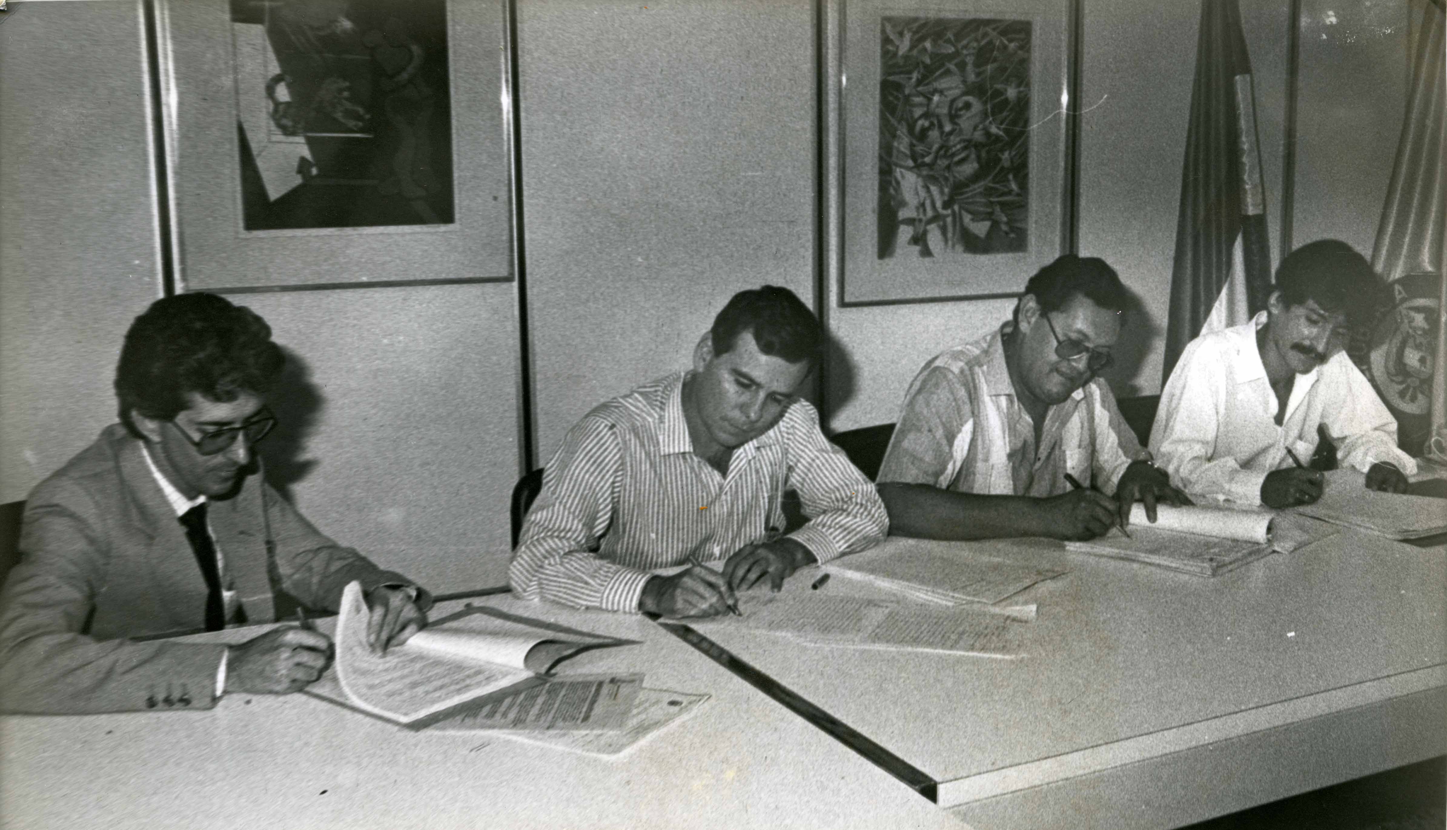 Diario Occidente (1987). Gustavo Rivera, gerente de Emcali, Eduardo Sardi, gerente de Automarcali, y Fernando Montoya, secretario general.. Santiago de Cali: Biblioteca Departamental Jorge Garcés Borrero.