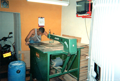 Plano medio. Imagen de un operario trabajando en una máquina. El sujeto mira su trabajo y no presta atención al fotógrafo. Sobresale el color amarillo en la pared en el fondo de la habitación. La moto al fondo denota algo de falta de espacio.