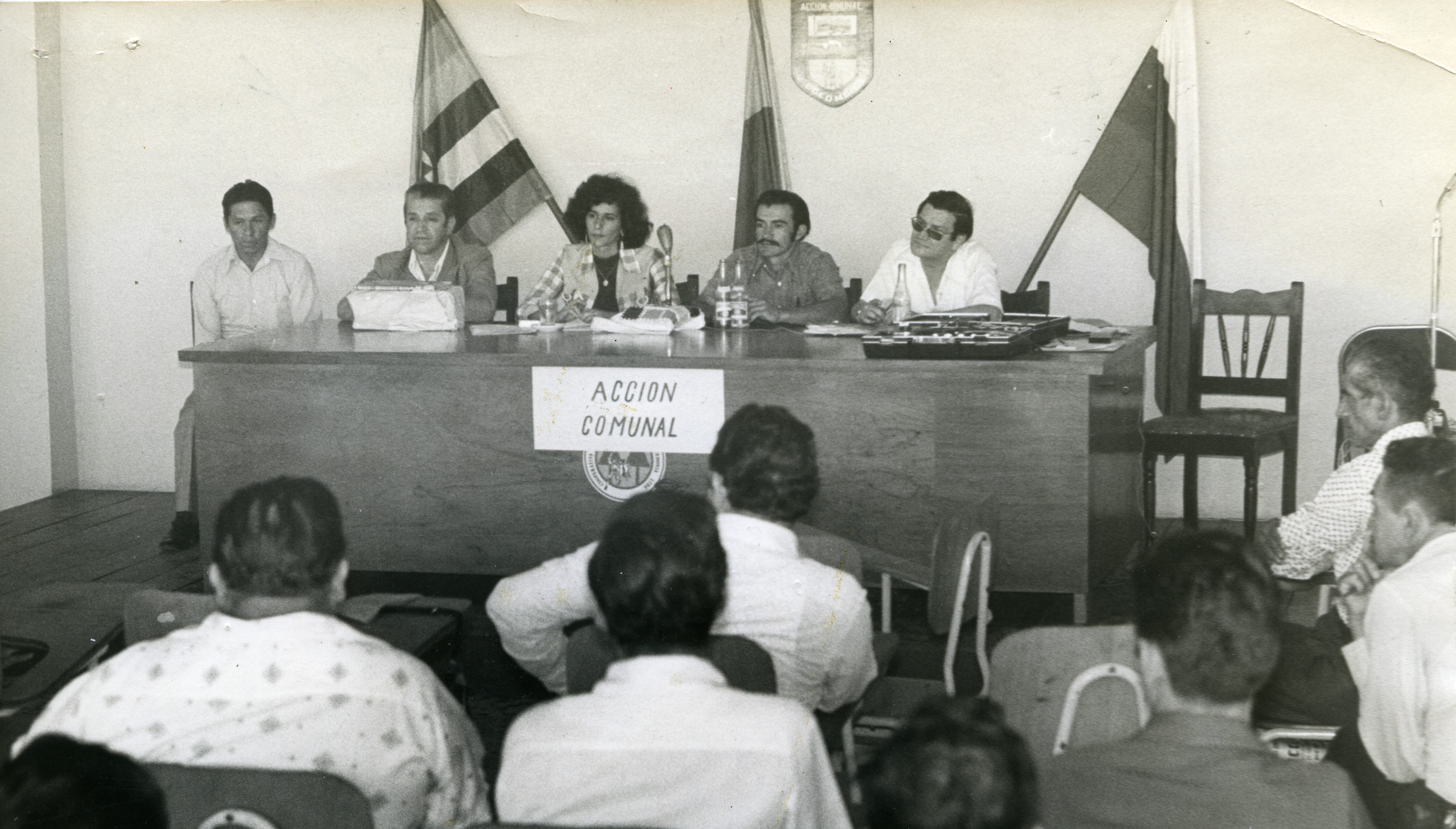 Al reverso de la fotografía se anexa el pie de foto del periódico: "En el salon de actos de la Cooperativa de caficultores, se reunieron en asamblea general representantes del municipio, barrios y veredas, con el fin de solicitar por intermedio de la Dra. Clara Molano, al gobierno nacional el nombramiento de promotor de acción comunal, bachillerato tecnico agricola, apertura de vias de penetración a diferentes zonas del municipio, restaurantes escolares veredales que veneficien al estudiantado campesino".