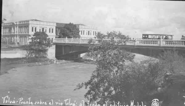 Puente sobre el río Tuluá. Al fondo se aprecia el edificio Modelo. Tuluá, Fecha aproximada: 1930.