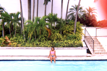 Plano medio. Toma realizada en exterior, donde se puede apreciar una joven sentada junto a una piscina, tiene su mirada dirigida hacia la cámara. Al fondo vegetación abundante.
