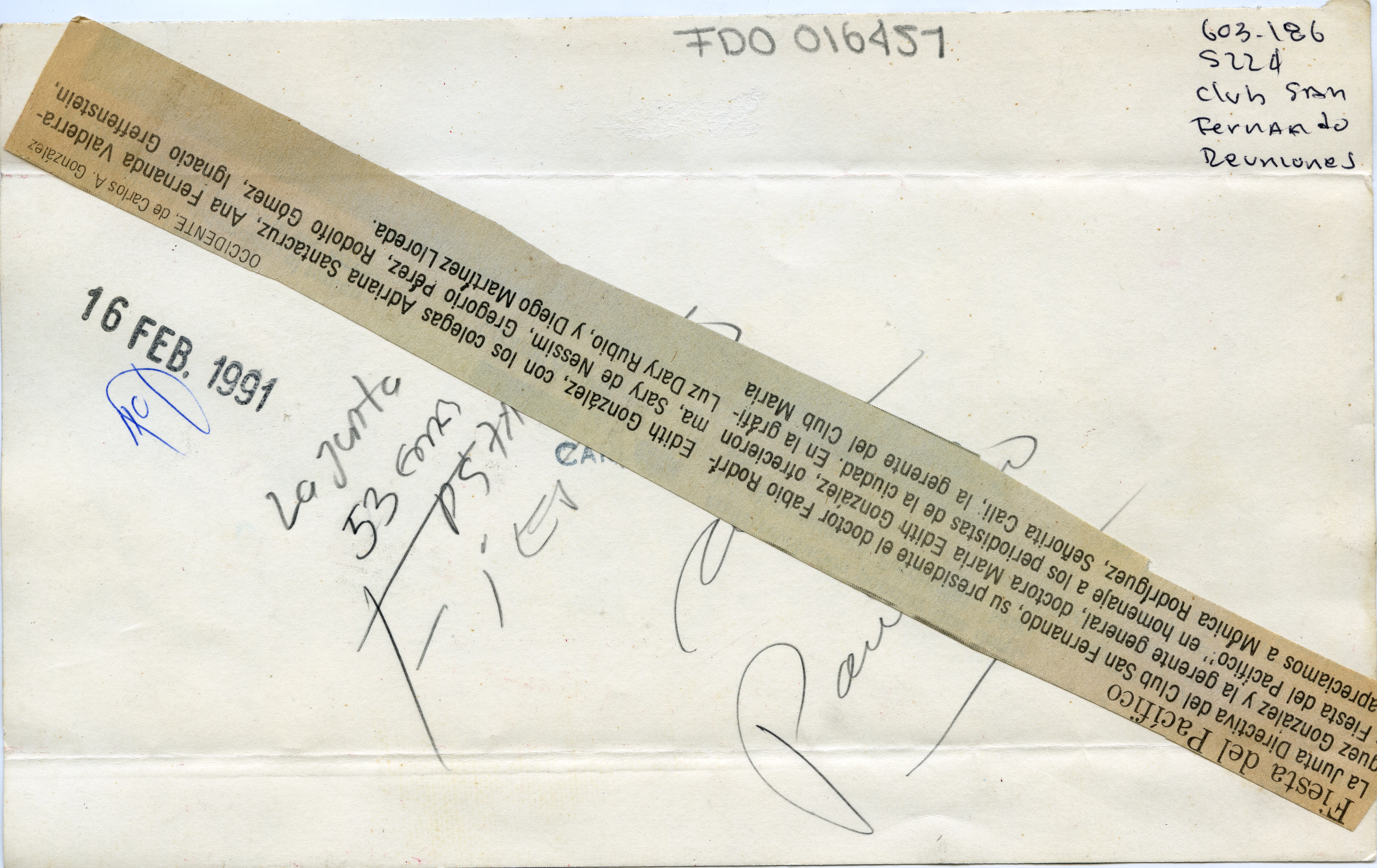 Al reverso de la fotografía se anexa recorte: "Fiesta del Pacífico. La junta directiva del Club San Fernando, su presidente el doctor Fabio Roríguez González y la gerente general, doctora María Edith González, ofrecieron la Fiesta del Pacífico en homenaje a los periodistas de la ciudad. En la gráfica apreciamos a Mónica Rodríguez, señorita Cali; la gerente del Club San Fernando, María Edith González, con los colegas Adriana Santacruz, Ana Fernanda Valderrama, Sary de Nessim, Gregorio Pérez, Rodolfo Gómez, Ignacio Greffenstein, Luz Dary Rubio, y Diego Martínez Lloreda."