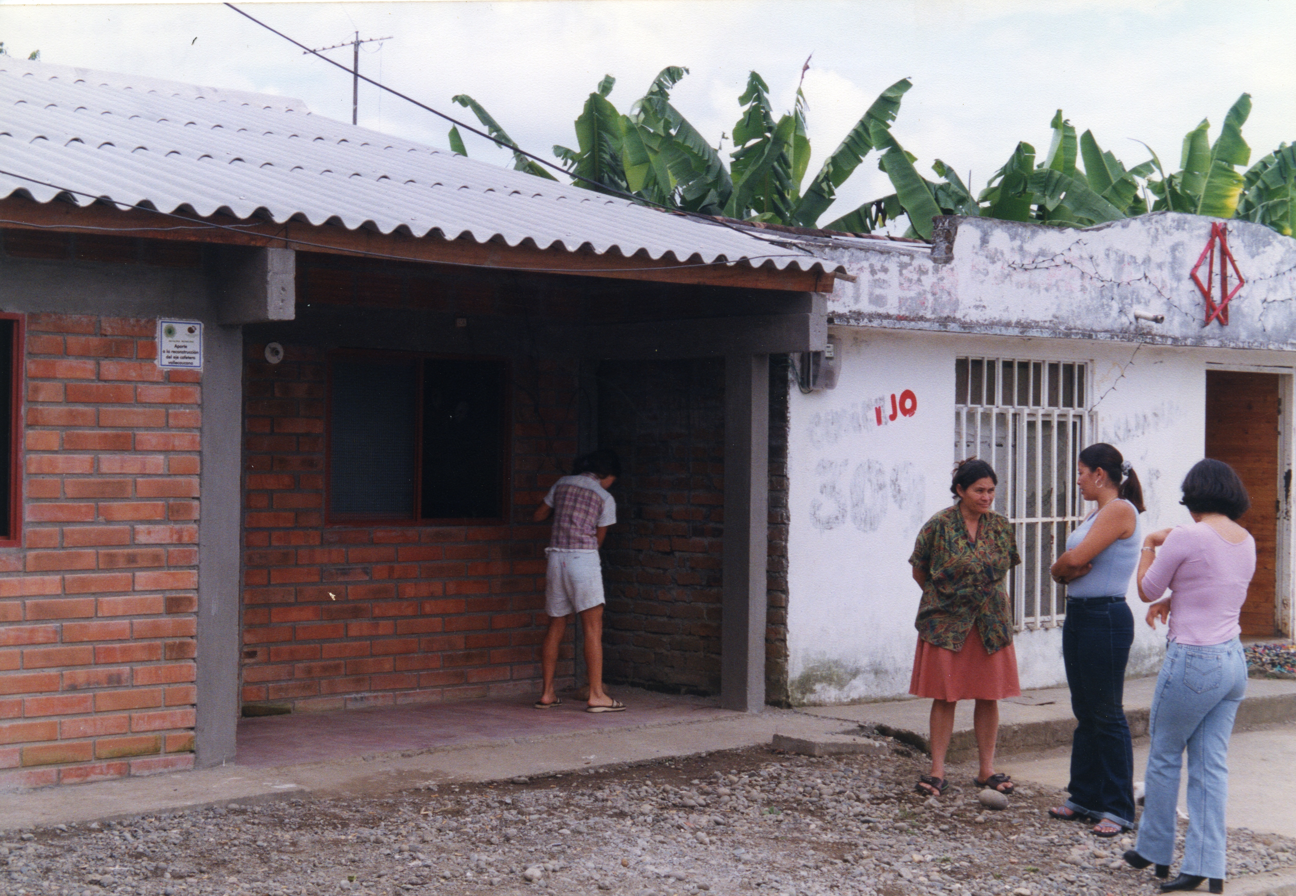 En la fotografia se observa cuatro mujeres, una se encuentra barriendo el corredor de la casa; esta casa es una de las construidas por el Fondo de Solidaridad del Valle del Cauca, la casa tiene un pequeño letrero en la parte superior , dice " Aporte a la reconstrucción del eje cafetero"; las otras tres mujeres, están sobre la calle.