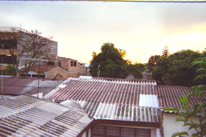 Loaiza Quintero, L. A. (2005). Plano general, parte inferior de la imagen ocupada de extremo a extremo por techos generando línea horizontal desde la que se aprecian a la derecha techos sumergidos entre frondosos árboles y a la izquierda edificaciones, en la parte superior de la imagen el cielo del amanecer con los rayos de sol brotando detrás de los árboles a la derecha. Santiago de Cali: Biblioteca Departamental Jorge Garces Borrero.