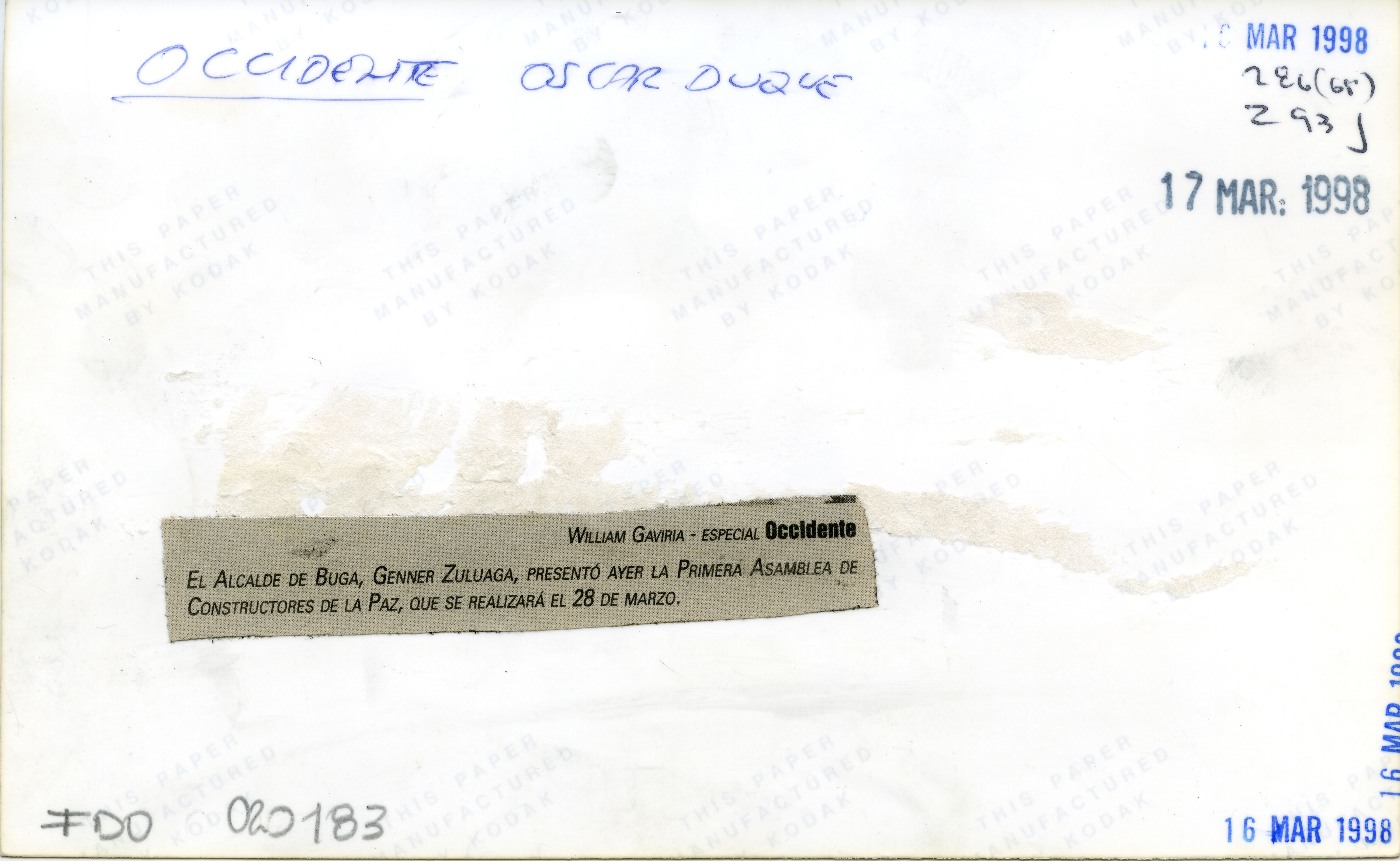 Al reverso de la fotografía se anexa recorte: " El alcalde de Buga, Genner Zuluaga, presento ayer la primera asamblea de constructores de paz que se realizará el 28 de marzo.
