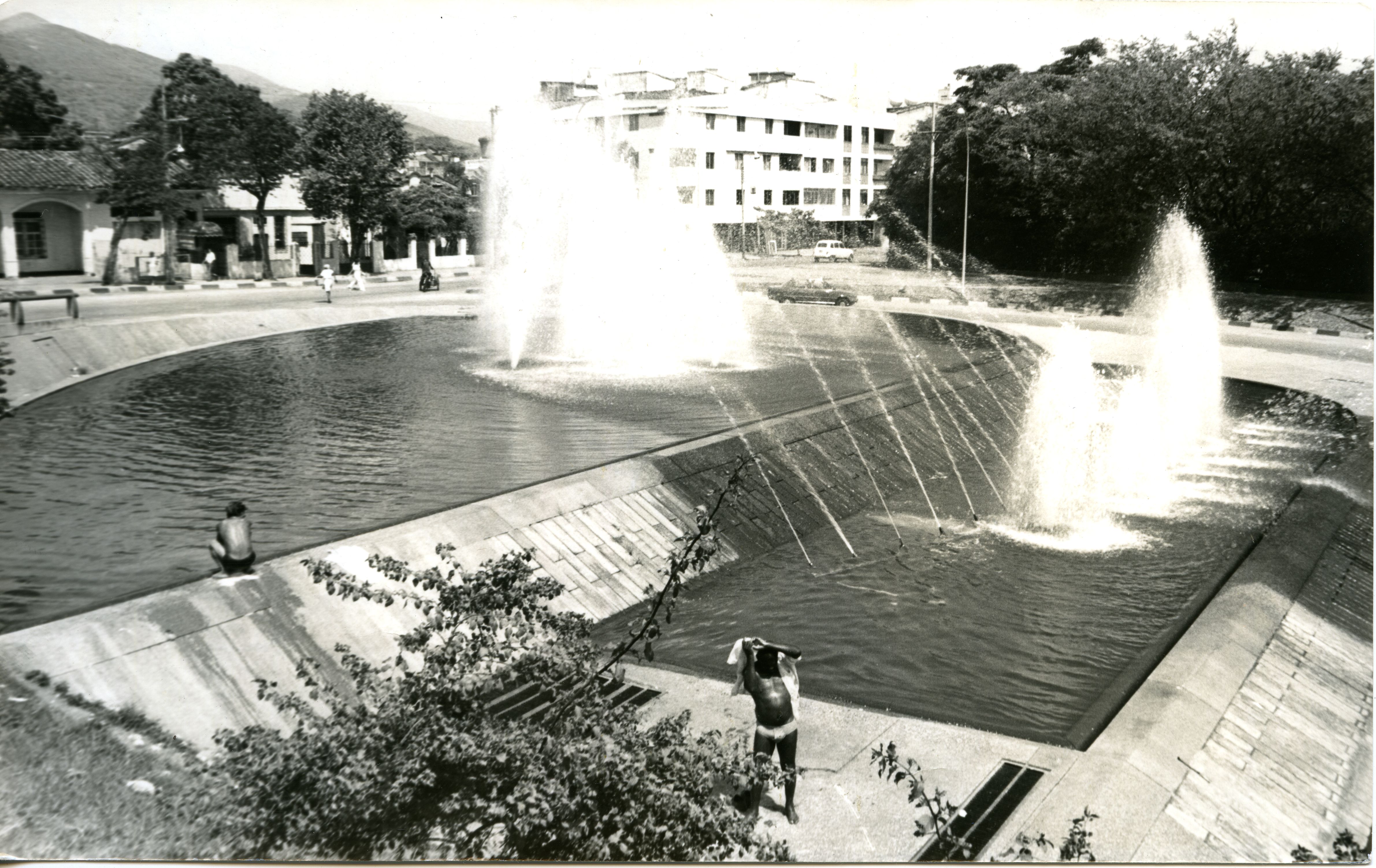 En la gráfica se observan dos personas bañándose en una fuente de agua como si fuera una piscina