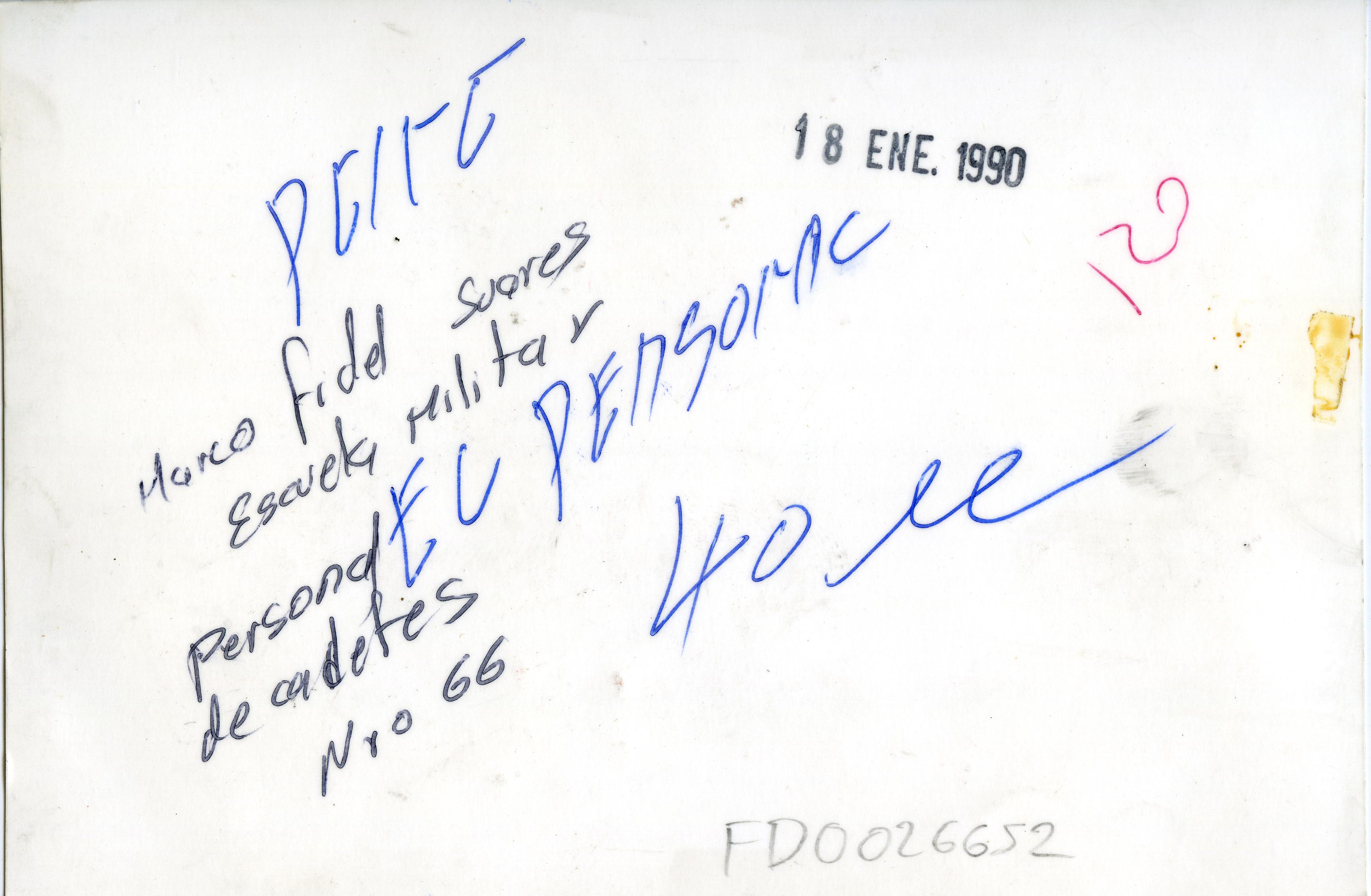 En la fotografía es posible observar cómo los cadetes de la escuela militar de aviación Marco Fidel Suárez marchan en forma organizada y guiada por un coronel, detrás de el es seguido por un cadete quien carga un báculo con una insignia en forma de águila en la punta y una bandera.