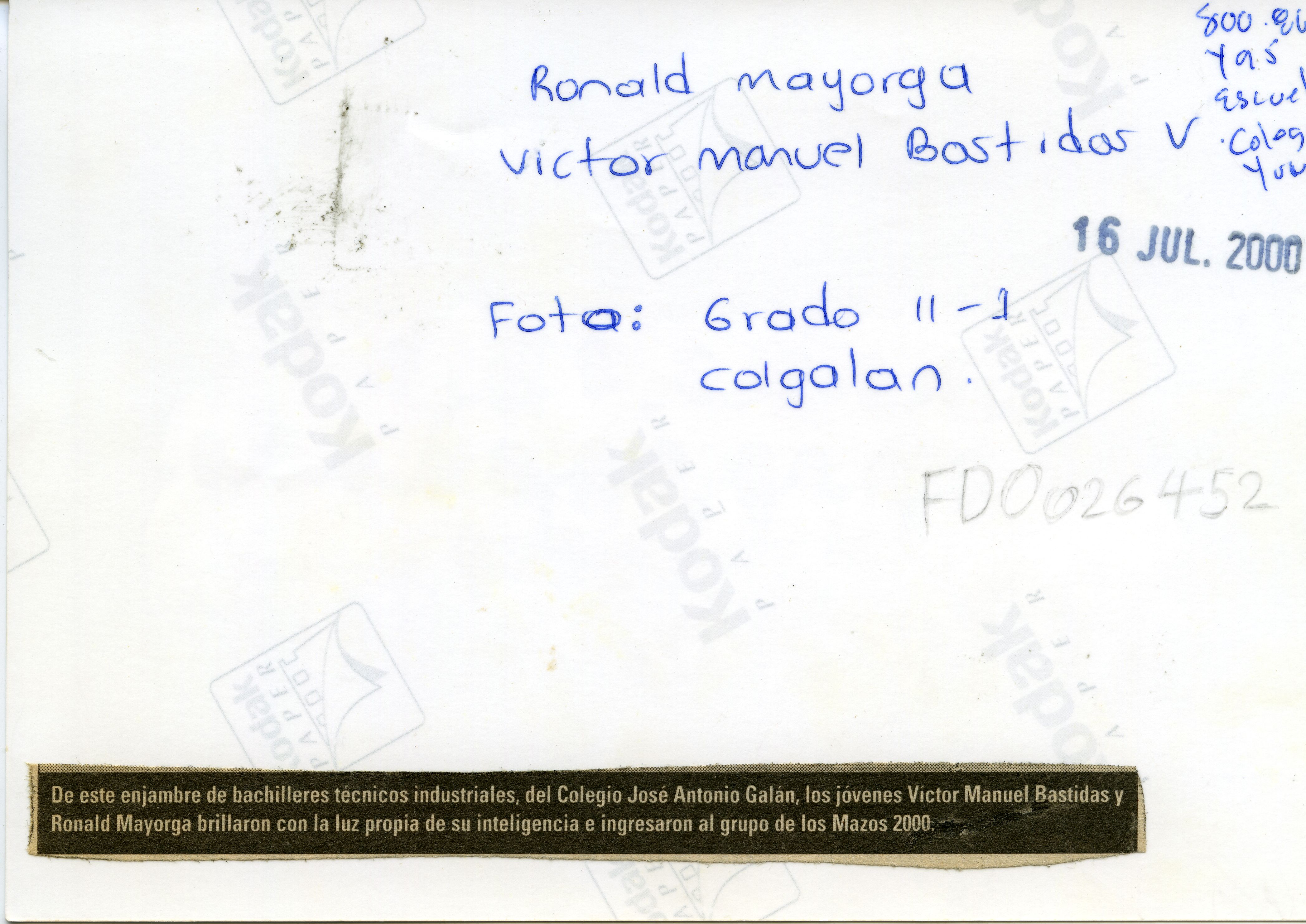 | dc.description.abstract | Al reverso de la fotografía se anexa recorte: De este enjambre de bachilleres técnicos industriales, del colegio José Antonio Galán, los jóvenes Víctor Manuel Bastidas y Ronald Mayorga brillaron con luz propia de su inteligencia e ingresaron al grupo de los mazos 2000. | spa |
