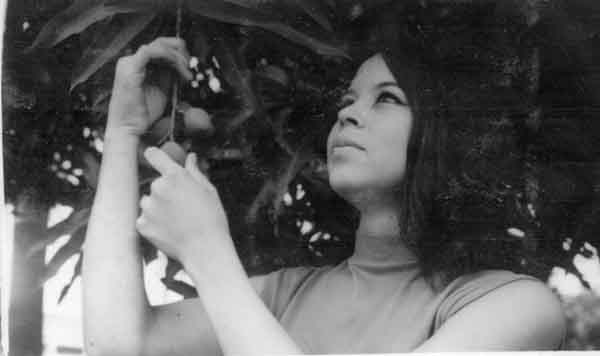 Gloria Villada cosechando mangos. Barrio La Base, Santiago de Cali. 1980.