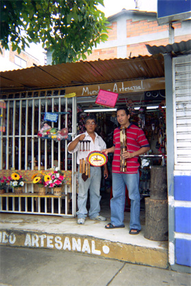 Plano medio. En la entrada a un negocio de artesanías dos hombres muestran a cámara varios objetos. Al fondo interior del local. Punto de vista exterior.