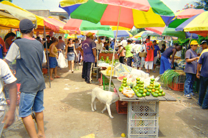 Plano medio. Se aprecia una plaza de mercado, con varios puestos de venta con parasoles de colores y productos exhibidos. Alrededor varias personas.